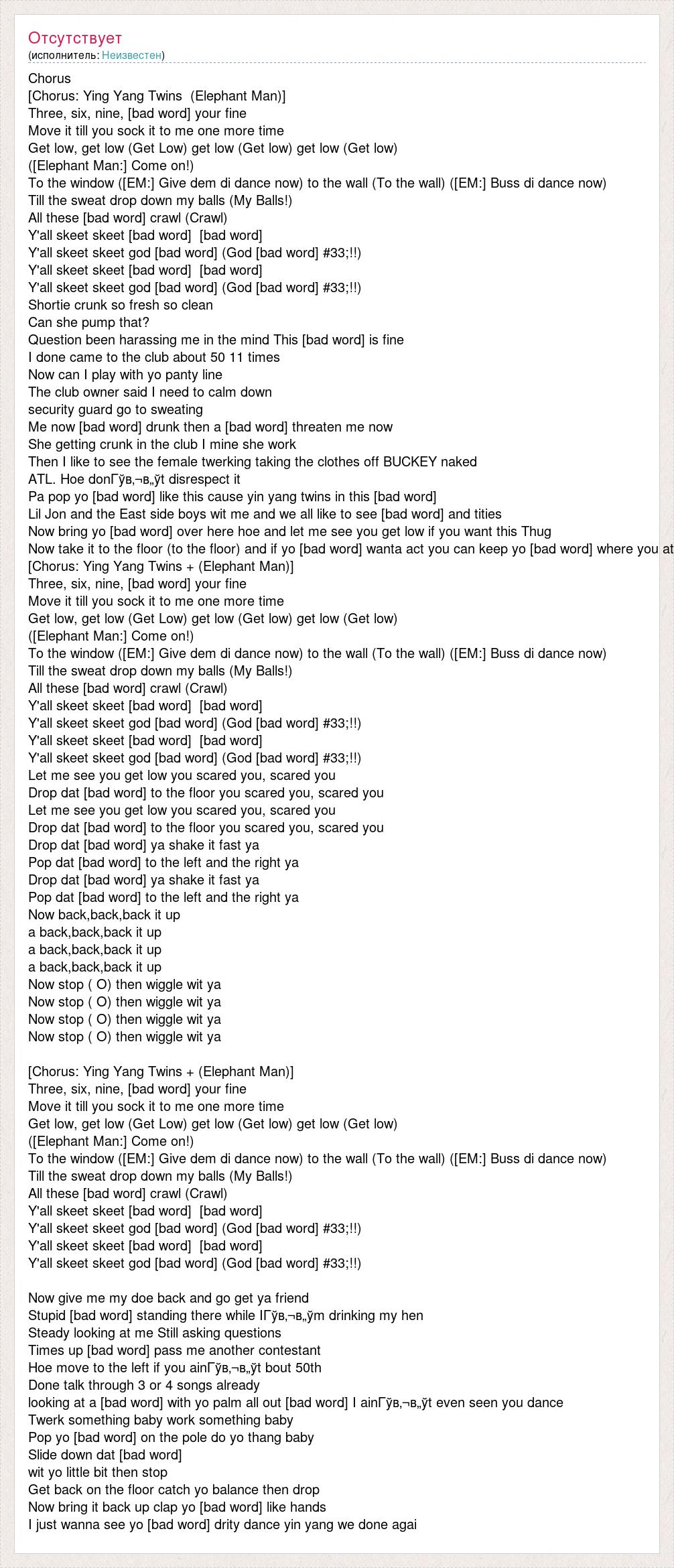 Chorus [Chorus: Ying Yang Twins (Elephant Man)] Three, six, nine, [bad word] your fine Move it till you sock it to me one more time Get low, get low (Get Low) get low (Get low) get low (Get low) ([Elephant Man:] Come on!) To the window ([EM:] Give dem di dance now) to the wall (To the wall) ([EM:] Buss di dance now) Till the sweat drop down my balls (My Balls!) All these [bad word] crawl (Crawl) Y'all skeet skeet [bad word] [bad word] Y'all skeet skeet god [bad word] (God [bad word] #33;!!) Y'all skeet skeet [bad word] [bad word] Y'all skeet skeet god [bad word] (God [bad word] #33;!!) Shortie crunk so fresh so clean Can she pump that? Question been harassing me in the mind This [bad word] is fine I done came to the club about 50 11 times Now can I play with yo panty line The club owner said I need to calm down security guard go to sweating Me now [bad word] drunk then a [bad word] threaten me now She getting crunk in the club I mine she work Then I like to see the female twerking taking the clothes off BUCKEY naked ATL. Hoe don’t disrespect it Pa pop yo [bad word] like this cause yin yang twins in this [bad word] Lil Jon and the East side boys wit me and we all like to see [bad word] and tities Now bring yo [bad word] over here hoe and let me see you get low if you want this Thug Now take it to the floor (to the floor) and if yo [bad word] wanta act you can keep yo [bad word] where you at [Chorus: Ying Yang Twins + (Elephant Man)] Three, six, nine, [bad word] your fine Move it till you sock it to me one more time Get low, get low (Get Low) get low (Get low) get low (Get low) ([Elephant Man:] Come on!) To the window ([EM:] Give dem di dance now) to the wall (To the wall) ([EM:] Buss di dance now) Till the sweat drop down my balls (My Balls!) All these [bad word] crawl (Crawl) Y'all skeet skeet [bad word] [bad word] Y'all skeet skeet god [bad word] (God [bad word] #33;!!) Y'all skeet skeet [bad word] [bad word] Y'all skeet skeet god [bad word] (God [bad word] #33;!!) Let me see you get low you scared you, scared you Drop dat [bad word] to the floor you scared you, scared you Let me see you get low you scared you, scared you Drop dat [bad word] to the floor you scared you, scared you Drop dat [bad word] ya shake it fast ya Pop dat [bad word] to the left and the right ya Drop dat [bad word] ya shake it fast ya Pop dat [bad word] to the left and the right ya Now back,back,back it up a back,back,back it up a back,back,back it up a back,back,back it up Now stop ( O) then wiggle wit ya Now stop ( O) then wiggle wit ya Now stop ( O) then wiggle wit ya Now stop ( O) then wiggle wit ya [Chorus: Ying Yang Twins + (Elephant Man)] Three, six, nine, [bad word] your fine Move it till you sock it to me one more time Get low, get low (Get Low) get low (Get low) get low (Get low) ([Elephant Man:] Come on!) To the window ([EM:] Give dem di dance now) to the wall (To the wall) ([EM:] Buss di dance now) Till the sweat drop down my balls (My Balls!) All these [bad word] crawl (Crawl) Y'all skeet skeet [bad word] [bad word] Y'all skeet skeet god [bad word] (God [bad word] #33;!!) Y'all skeet skeet [bad word] [bad word] Y'all skeet skeet god [bad word] (God [bad word] #33;!!) Now give me my doe back and go get ya friend Stupid [bad word] standing there while I’m drinking my hen Steady looking at me Still asking questions Times up [bad word] pass me another contestant Hoe move to the left if you ain’t bout 50th Done talk through 3 or 4 songs already looking at a [bad word] with yo palm all out [bad word] I ain’t even seen you dance Twerk something baby work something baby Pop yo [bad word] on the pole do yo thang baby Slide down dat [bad word] wit yo little bit then stop Get back on the floor catch yo balance then drop Now bring it back up clap yo [bad word] like hands I just wanna see yo [bad word] drity dance yin yang we done agai
