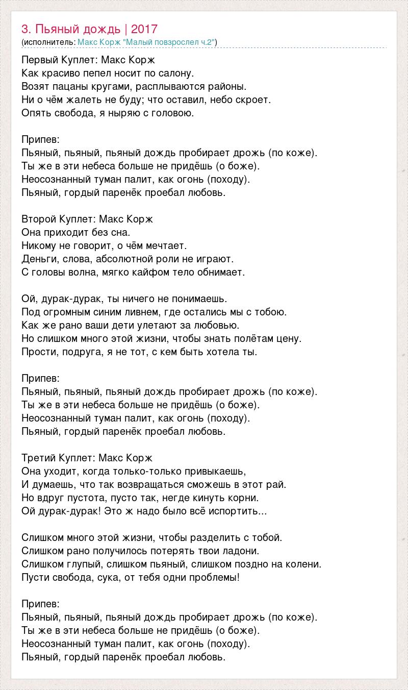 Первый Куплет: Макс Корж Как красиво пепел носит по салону. Возят пацаны кругами, расплываются районы. Ни о чём жалеть не буду; что оставил, небо скроет. Опять свобода, я ныряю с головою. Припев: Пьяный, пьяный, пьяный дождь пробирает дрожь (по коже). Ты же в эти небеса больше не придёшь (о боже). Неосознанный туман палит, как огонь (походу). Пьяный, гордый паренёк проебал любовь. Второй Куплет: Макс Корж Она приходит без сна. Никому не говорит, о чём мечтает. Деньги, слова, абсолютной роли не играют. С головы волна, мягко кайфом тело обнимает. Ой, дурак-дурак, ты ничего не понимаешь. Под огромным синим ливнем, где остались мы с тобою. Как же рано ваши дети улетают за любовью. Но слишком много этой жизни, чтобы знать полётам цену. Прости, подруга, я не тот, с кем быть хотела ты. Припев: Пьяный, пьяный, пьяный дождь пробирает дрожь (по коже). Ты же в эти небеса больше не придёшь (о боже). Неосознанный туман палит, как огонь (походу). Пьяный, гордый паренёк проебал любовь. Третий Куплет: Макс Корж Она уходит, когда только-только привыкаешь, И думаешь, что так возвращаться сможешь в этот рай. Но вдруг пустота, пусто так, негде кинуть корни. Ой дурак-дурак! Это ж надо было всё испортить... Слишком много этой жизни, чтобы разделить с тобой. Слишком рано получилось потерять твои ладони. Слишком глупый, слишком пьяный, слишком поздно на колени. Пусти свобода, сука, от тебя одни проблемы! Припев: Пьяный, пьяный, пьяный дождь пробирает дрожь (по коже). Ты же в эти небеса больше не придёшь (о боже). Неосознанный туман палит, как огонь (походу). Пьяный, гордый паренёк проебал любовь.