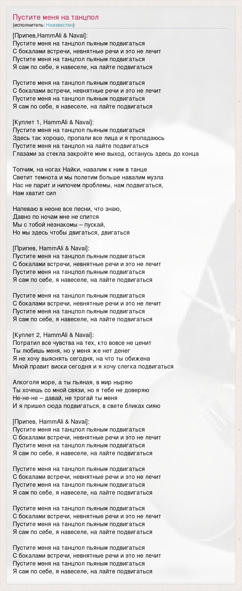 [Припев,HammAli & Navai]: Пустите меня на танцпол пьяным подвигаться С бокалами встречи, невнятные речи и это не лечит Пустите меня на танцпол пьяным подвигаться Я сам по себе, я навеселе, на лайте подвигаться Пустите меня на танцпол пьяным подвигаться С бокалами встречи, невнятные речи и это не лечит Пустите меня на танцпол пьяным подвигаться Я сам по себе, я навеселе, на лайте подвигаться [Куплет 1, HammAli & Navai]: Пустите меня на танцпол пьяным подвигаться Здесь так хорошо, пропали все лица и я пропадаюсь Пустите меня на танцпол на лайте подвигаться Глазами за стекла закройте мне выход, останусь здесь до конца Топчим, на ногах Найки, навалим к ним в танце Светит темнота и мы полетим больше навалим музла Нас не парит и нипочем проблемы, нам подвигаться, Нам хватит сил Напеваю в неоне все песни, что знаю, Давно по ночам мне не спится Мы с тобой незнакомы – пускай, Но мы здесь чтобы двигаться, двигаться [Припев, HammAli & Navai]: Пустите меня на танцпол пьяным подвигаться С бокалами встречи, невнятные речи и это не лечит Пустите меня на танцпол пьяным подвигаться Я сам по себе, я навеселе, на лайте подвигаться Пустите меня на танцпол пьяным подвигаться С бокалами встречи, невнятные речи и это не лечит Пустите меня на танцпол пьяным подвигаться Я сам по себе, я навеселе, на лайте подвигаться [Куплет 2, HammAli & Navai]: Потратил все чувства на тех, кто вовсе не ценит Ты любишь меня, но у меня же нет денег Я не хочу выяснять сегодня, на что ты обижена Мной правит виски сегодня и я хочу слегка подвигаться Алкоголя море, а ты пьяная, в мир ныряю Ты хочешь со мной связи, но я тебе не доверяю Не-не-не – давай, не трогай ты меня И я пришел сюда подвигаться, в свете бликах сияю [Припев, HammAli & Navai]: Пустите меня на танцпол пьяным подвигаться С бокалами встречи, невнятные речи и это не лечит Пустите меня на танцпол пьяным подвигаться Я сам по себе, я навеселе, на лайте подвигаться Пустите меня на танцпол пьяным подвигаться С бокалами встречи, невнятные речи и это не лечит Пустите меня на танцпол пьяным подвигаться Я сам по себе, я навеселе, на лайте подвигаться Пустите меня на танцпол пьяным подвигаться С бокалами встречи, невнятные речи и это не лечит Пустите меня на танцпол пьяным подвигаться Я сам по себе, я навеселе, на лайте подвигаться Пустите меня на танцпол пьяным подвигаться С бокалами встречи, невнятные речи и это не лечит Пустите меня на танцпол пьяным подвигаться Я сам по себе, я навеселе, на лайте подвигаться
