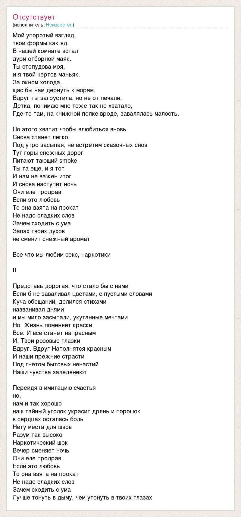 Мой упоротый взгляд, твои формы как яд. В нашей комнате встал дури отборной маяк. Ты стопудова моя, и я твой чертов маньяк. За окном холода, щас бы нам дернуть к морям. Вдруг ты загрустила, но не от печали, Детка, понимаю мне тоже так не хватало, Где-то там, на книжной полке вроде, завалялась малость. Но этого хватит чтобы влюбиться вновь Снова станет легко Под утро засыпая, не встретим сказочных снов Тут горы снежных дорог Питают тающий smoke Ты та еще, и я тот И нам не важен итог И снова наступит ночь Очи еле продрав Если это любовь То она взята на прокат Не надо сладких слов Зачем сходить с ума Запах твоих духов не сменит снежный аромат Все что мы любим секс, наркотики II Представь дорогая, что стало бы с нами Если б не заваливал цветами, с пустыми словами Куча обещаний, делился стихами названивал днями и мы мило засыпали, укутанные мечтами Но. Жизнь поменяет краски Все. И все станет напрасным И. Твои розовые глазки Вдруг. Вдруг Наполнятся красным И наши прежние страсти Под гнетом бытовых ненастий Наши чувства заледенеют Перейдя в имитацию счастья но, нам и так хорошо наш тайный уголок украсит дрянь и порошок в сердцах осталась боль Нету места для швов Разум так высоко Наркотический шок Вечер сменяет ночь Очи еле продрав Если это любовь То она взята на прокат Не надо сладких слов Зачем сходить с ума Лучше тонуть в дыму, чем утонуть в твоих глазах