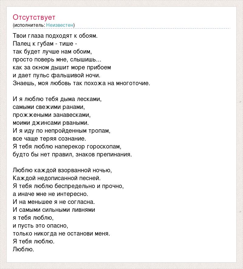 Твои глаза подходят к обоям. Палец к губам - тише - так будет лучше нам обоим, просто поверь мне, слышишь... как за окном дышит море прибоем и дает пульс фальшивой ночи. Знаешь, моя любовь так похожа на многоточие. И я люблю тебя дыма лесками, самыми свежими ранами, прожжеными занавесками, моими джинсами рваными. И я иду по непройденным тропам, все чаще теряя сознание. Я тебя люблю наперекор гороскопам, будто бы нет правил, знаков препинания. Люблю каждой взорванной ночью, Каждой недописанной песней. Я тебя люблю беспредельно и прочно, а иначе мне не интересно. И на меньшее я не согласна. И самыми сильными ливнями я тебя люблю, и пусть это опасно, только никогда не останови меня. Я тебя люблю. Люблю.