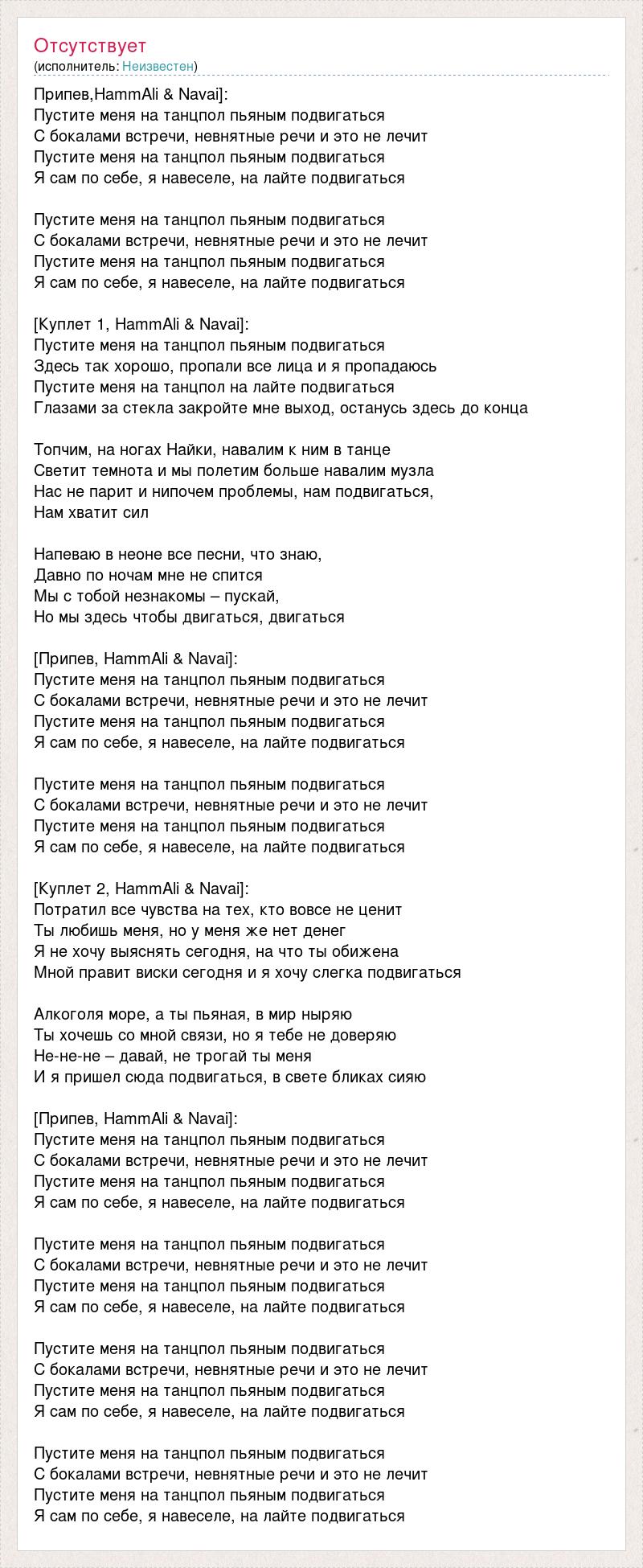 Припев,HammAli & Navai]: Пустите меня на танцпол пьяным подвигаться С бокалами встречи, невнятные речи и это не лечит Пустите меня на танцпол пьяным подвигаться Я сам по себе, я навеселе, на лайте подвигаться Пустите меня на танцпол пьяным подвигаться С бокалами встречи, невнятные речи и это не лечит Пустите меня на танцпол пьяным подвигаться Я сам по себе, я навеселе, на лайте подвигаться [Куплет 1, HammAli & Navai]: Пустите меня на танцпол пьяным подвигаться Здесь так хорошо, пропали все лица и я пропадаюсь Пустите меня на танцпол на лайте подвигаться Глазами за стекла закройте мне выход, останусь здесь до конца Топчим, на ногах Найки, навалим к ним в танце Светит темнота и мы полетим больше навалим музла Нас не парит и нипочем проблемы, нам подвигаться, Нам хватит сил Напеваю в неоне все песни, что знаю, Давно по ночам мне не спится Мы с тобой незнакомы – пускай, Но мы здесь чтобы двигаться, двигаться [Припев, HammAli & Navai]: Пустите меня на танцпол пьяным подвигаться С бокалами встречи, невнятные речи и это не лечит Пустите меня на танцпол пьяным подвигаться Я сам по себе, я навеселе, на лайте подвигаться Пустите меня на танцпол пьяным подвигаться С бокалами встречи, невнятные речи и это не лечит Пустите меня на танцпол пьяным подвигаться Я сам по себе, я навеселе, на лайте подвигаться [Куплет 2, HammAli & Navai]: Потратил все чувства на тех, кто вовсе не ценит Ты любишь меня, но у меня же нет денег Я не хочу выяснять сегодня, на что ты обижена Мной правит виски сегодня и я хочу слегка подвигаться Алкоголя море, а ты пьяная, в мир ныряю Ты хочешь со мной связи, но я тебе не доверяю Не-не-не – давай, не трогай ты меня И я пришел сюда подвигаться, в свете бликах сияю [Припев, HammAli & Navai]: Пустите меня на танцпол пьяным подвигаться С бокалами встречи, невнятные речи и это не лечит Пустите меня на танцпол пьяным подвигаться Я сам по себе, я навеселе, на лайте подвигаться Пустите меня на танцпол пьяным подвигаться С бокалами встречи, невнятные речи и это не лечит Пустите меня на танцпол пьяным подвигаться Я сам по себе, я навеселе, на лайте подвигаться Пустите меня на танцпол пьяным подвигаться С бокалами встречи, невнятные речи и это не лечит Пустите меня на танцпол пьяным подвигаться Я сам по себе, я навеселе, на лайте подвигаться Пустите меня на танцпол пьяным подвигаться С бокалами встречи, невнятные речи и это не лечит Пустите меня на танцпол пьяным подвигаться Я сам по себе, я навеселе, на лайте подвигаться