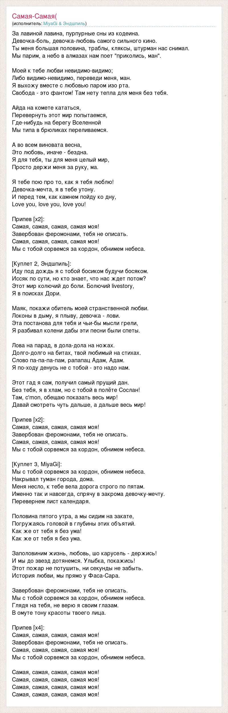 За лавиной лавина, пурпурные сны из кодеина. Девочка-боль, девочка-любовь самого сильного кино. Ты меня большая половина, траблы, кляксы, штурман нас снимал. Мы парим, а небо в алмазах нам поет "приколись, ман". Моей к тебе любви невидимо-видимо; Либо видимо-невидимо, переведи меня, ман. Я выхожу вместе с любовью паром изо рта. Свобода - это фантом! Там нету тепла для меня без тебя. Айда на комете кататься, Перевернуть этот мир попытаемся, Где-нибудь на берегу Вселенной Мы типа в брюликах переливаемся. А во всем виновата весна, Это любовь, иначе - бездна. Я для тебя, ты для меня целый мир, Просто держи меня за руку, ма. Я тебе пою про то, как я тебя люблю! Девочка-мечта, я в тебе утону. И перед тем, как камнем пойду ко дну, Love you, love you, love you! Припев [х2]: Самая, самая, самая, самая моя! Завербован феромонами, тебя не описать. Самая, самая, самая, самая моя! Мы с тобой сорвемся за кордон, обнимем небеса. [Куплет 2, Эндшпиль]: Иду под дождь я с тобой босиком будучи босяком. Иссяк по сути, но кто знает, что нас ждет потом? Этот мир колючий до боли. Болючий livestory, Я в поисках Дори. Маяк, покажи обитель моей странственной любви. Локоны в дыму, я плыву, девочка - лови. Эта постанова для тебя и чьи-бы мысли грели, Я разбивал колени дабы эти песни были спеты. Лова на парад, в дола-дола на ножах. Долго-долго на битах, твой любимый на стихах. Слово па-па-па-пам, рапапац Адам, Адам. Я по-ходу денусь не с тобой - это надо нам. Этот гад я сам, получил самый прущий дан. Без тебя, я в хлам, но с тобой в полёте Сослан! Там, c'mon, обещаю показать весь мир! Давай смотреть чуть дальше, а дальше весь мир! Припев [х2]: Самая, самая, самая, самая моя! Завербован феромонами, тебя не описать. Самая, самая, самая, самая моя! Мы с тобой сорвемся за кордон, обнимем небеса. [Куплет 3, MiyaGi]: Мы с тобой сорвемся за кордон, обнимем небеса. Накрывал туман города, дома. Меня несло, к тебе вела дорога строго по пятам. Именно так и навсегда, спрячу в закрома девочку-мечту. Перевернем лист календаря. Половина пятого утра, а мы сидим на закате, Погружаясь головой в глубины этих объятий. Как же от тебя я без ума! Как же от тебя я без ума. Заполовиним жизнь, любовь, шо карусель - держись! И мы до звезд дотянемся. Улыбка, покажись! Этот пожар не потушить, ни секунды не забыть. История любви, мы прямо у Фаса-Сара. Завербован феромонами, тебя не описать. Мы с тобой сорвемся за кордон, обнимем небеса. Глядя на тебя, не верю я своим глазам. В омуте тону красоты твоего лица. Припев [х4]: Самая, самая, самая, самая моя! Завербован феромонами, тебя не описать. Самая, самая, самая, самая моя! Мы с тобой сорвемся за кордон, обнимем небеса. Самая, самая, самая, самая моя! Самая, самая, самая, самая моя! Самая, самая, самая, самая моя! Самая, самая, самая, самая моя!