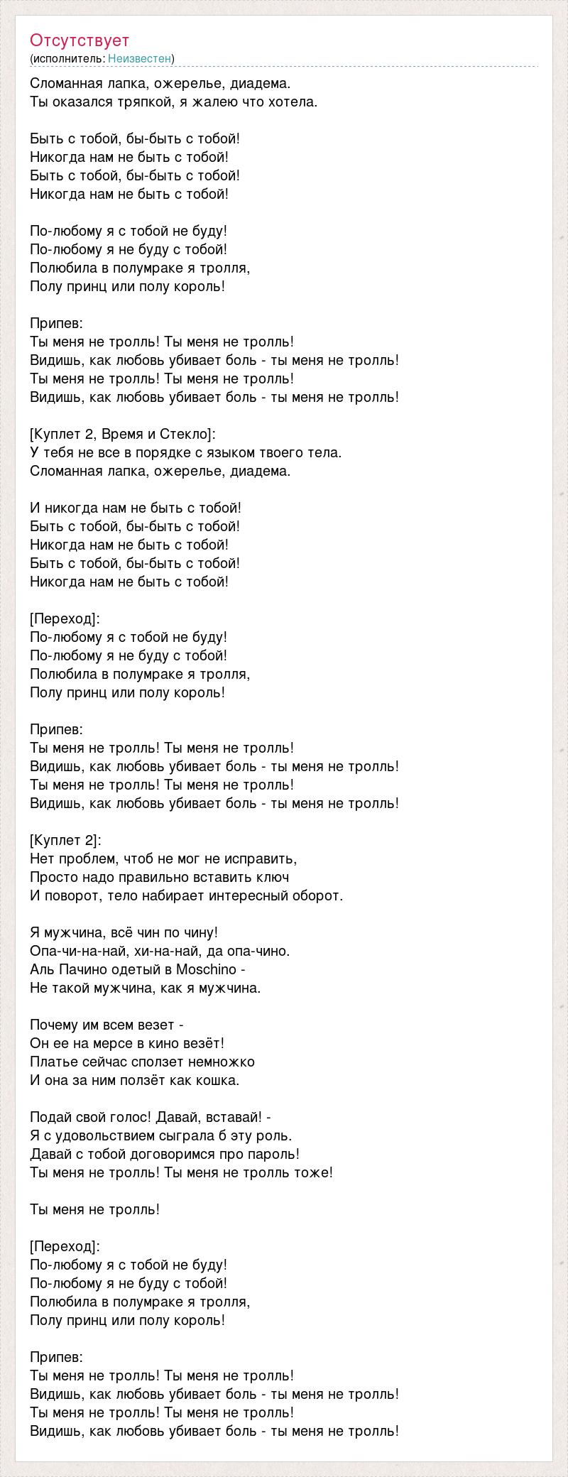 Сломанная лапка, ожерелье, диадема. Ты оказался тряпкой, я жалею что хотела. Быть с тобой, бы-быть с тобой! Никогда нам не быть с тобой! Быть с тобой, бы-быть с тобой! Никогда нам не быть с тобой! По-любому я с тобой не буду! По-любому я не буду с тобой! Полюбила в полумраке я тролля, Полу принц или полу король! Припев: Ты меня не тролль! Ты меня не тролль! Видишь, как любовь убивает боль - ты меня не тролль! Ты меня не тролль! Ты меня не тролль! Видишь, как любовь убивает боль - ты меня не тролль! [Куплет 2, Время и Стекло]: У тебя не все в порядке с языком твоего тела. Сломанная лапка, ожерелье, диадема. И никогда нам не быть с тобой! Быть с тобой, бы-быть с тобой! Никогда нам не быть с тобой! Быть с тобой, бы-быть с тобой! Никогда нам не быть с тобой! [Переход]: По-любому я с тобой не буду! По-любому я не буду с тобой! Полюбила в полумраке я тролля, Полу принц или полу король! Припев: Ты меня не тролль! Ты меня не тролль! Видишь, как любовь убивает боль - ты меня не тролль! Ты меня не тролль! Ты меня не тролль! Видишь, как любовь убивает боль - ты меня не тролль! [Куплет 2]: Нет проблем, чтоб не мог не исправить, Просто надо правильно вставить ключ И поворот, тело набирает интересный оборот. Я мужчина, всё чин по чину! Опа-чи-на-най, xи-на-най, да опа-чино. Аль Пачино одетый в Moschino - Не такой мужчина, как я мужчина. Почему им всем везет - Он ее на мерсе в кино везёт! Платье сейчас сползет немножко И она за ним ползёт как кошка. Подай свой голос! Давай, вставай! - Я с удовольствием сыграла б эту роль. Давай с тобой договоримся про пароль! Ты меня не тролль! Ты меня не тролль тоже! Ты меня не тролль! [Переход]: По-любому я с тобой не буду! По-любому я не буду с тобой! Полюбила в полумраке я тролля, Полу принц или полу король! Припев: Ты меня не тролль! Ты меня не тролль! Видишь, как любовь убивает боль - ты меня не тролль! Ты меня не тролль! Ты меня не тролль! Видишь, как любовь убивает боль - ты меня не тролль!