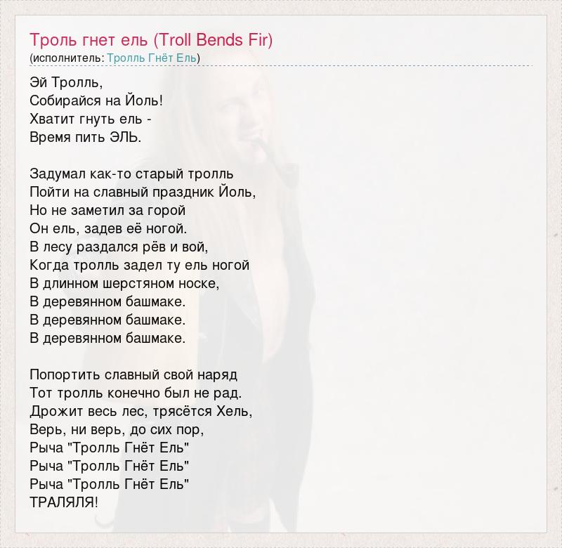 Эй Тролль, Собирайся на Йоль! Хватит гнуть ель - Время пить ЭЛЬ. Задумал как-то старый тролль Пойти на славный праздник Йоль, Но не заметил за горой Он ель, задев её ногой. В лесу раздался рёв и вой, Когда тролль задел ту ель ногой В длинном шерстяном носке, В деревянном башмаке. В деревянном башмаке. В деревянном башмаке. Попортить славный свой наряд Тот тролль конечно был не рад. Дрожит весь лес, трясётся Хель, Верь, ни верь, до сих пор, Рыча "Тролль Гнёт Ель" Рыча "Тролль Гнёт Ель" Рыча "Тролль Гнёт Ель" ТРАЛЯЛЯ!