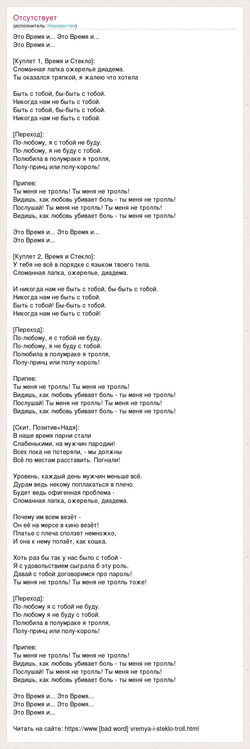 Это Время и... Это Время и... Это Время и... [Куплет 1, Время и Стекло]: Сломанная лапка ожерелья диадема. Ты оказался тряпкой, я жалею что хотела Быть с тобой, бы-быть с тобой. Никогда нам не быть с тобой. Быть с тобой, бы-быть с тобой. Никогда нам не быть с тобой. [Переход]: По-любому, я с тобой не буду. По-любому, я не буду с тобой. Полюбила в полумраке я тролля, Полу-принц или полу-король! Припев: Ты меня не тролль! Ты меня не тролль! Видишь, как любовь убивает боль - ты меня не тролль! Послушай! Ты меня не тролль! Ты меня не тролль! Видишь, как любовь убивает боль - ты меня не тролль! Это Время и... Это Время и... Это Время и... [Куплет 2, Время и Стекло]: У тебя не всё в порядке с языком твоего тела. Сломанная лапка, ожерелье, диадема. И никогда нам не быть с тобой, бы-быть с тобой. Никогда нам не быть с тобой. Быть с тобой! Бы-быть с тобой. Никогда нам не быть с тобой! [Переход]: По-любому, я с тобой не буду. По-любому, я не буду с тобой. Полюбила в полумраке я тролля, Полу-принц или полу-король! Припев: Ты меня не тролль! Ты меня не тролль! Видишь, как любовь убивает боль - ты меня не тролль! Послушай! Ты меня не тролль! Ты меня не тролль! Видишь, как любовь убивает боль - ты меня не тролль! [Скит, Позитив+Надя]: В наше время парни стали Слабенькими, на мужчин пародии! Всех пока не потеряли, - мы должны Всё по местам расставить. Погнали! Уровень, каждый день мужчин меньше всё. Дурам ведь некому поплакаться в плечо. Будет ведь офигенная проблема - Сломанная лапка, ожерелье, диадема. Почему им всем везёт - Он её на мерсе в кино везёт! Платье с плеча сползет немножко, И она к нему ползёт, как кошка. Хоть раз бы так у нас было с тобой - Я с удовольствием сыграла б эту роль. Давай с тобой договоримся про пароль! Ты меня не тролль! Ты меня не тролль тоже! [Переход]: По-любому я с тобой не буду. По-любому я не буду с тобой. Полюбила в полумраке я тролля, Полу-принц или полу-король! Припев: Ты меня не тролль! Ты меня не тролль! Видишь, как любовь убивает боль - ты меня не тролль! Послушай! Ты меня не тролль! Ты меня не тролль! Видишь, как любовь убивает боль - ты меня не тролль! Это Время и... Это Время... Это Время и... Это Время... Это Время и... Читать на сайте: https://www [bad word] vremya-i-steklo-troll.html