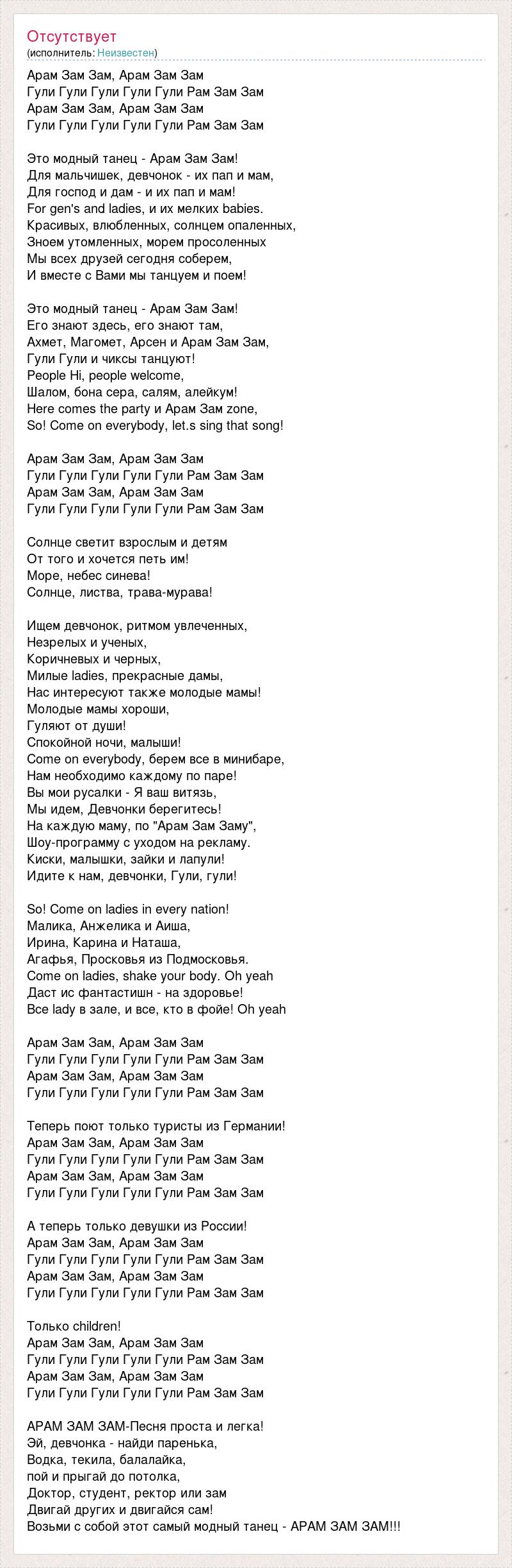 Арам Зам Зам, Арам Зам Зам Гули Гули Гули Гули Гули Рам Зам Зам Арам Зам Зам, Арам Зам Зам Гули Гули Гули Гули Гули Рам Зам Зам Это модный танец - Арам Зам Зам! Для мальчишек, девчонок - их пап и мам, Для господ и дам - и их пап и мам! For gen's and ladies, и их мелких babies. Красивых, влюбленных, солнцем опаленных, Зноем утомленных, морем просоленных Мы всех друзей сегодня соберем, И вместе с Вами мы танцуем и поем! Это модный танец - Арам Зам Зам! Его знают здесь, его знают там, Ахмет, Магомет, Арсен и Арам Зам Зам, Гули Гули и чиксы танцуют! People Hi, people welcome, Шалом, бона сера, салям, алейкум! Here comes the party и Арам Зам zone, So! Come on everybody, let.s sing that song! Арам Зам Зам, Арам Зам Зам Гули Гули Гули Гули Гули Рам Зам Зам Арам Зам Зам, Арам Зам Зам Гули Гули Гули Гули Гули Рам Зам Зам Солнце светит взрослым и детям От того и хочется петь им! Море, небес синева! Солнце, листва, трава-мурава! Ищем девчонок, ритмом увлеченных, Незрелых и ученых, Коричневых и черных, Милые ladies, прекрасные дамы, Нас интересуют также молодые мамы! Молодые мамы хороши, Гуляют от души! Спокойной ночи, малыши! Come on everybody, берем все в минибаре, Нам необходимо каждому по паре! Вы мои русалки - Я ваш витязь, Мы идем, Девчонки берегитесь! На каждую маму, по "Арам Зам Заму", Шоу-программу с уходом на рекламу. Киски, малышки, зайки и лапули! Идите к нам, девчонки, Гули, гули! So! Come on ladies in every nation! Малика, Анжелика и Аиша, Ирина, Карина и Наташа, Агафья, Просковья из Подмосковья. Come on ladies, shake your body. Oh yeah Даст ис фантастишн - на здоровье! Все lady в зале, и все, кто в фойе! Oh yeah Арам Зам Зам, Арам Зам Зам Гули Гули Гули Гули Гули Рам Зам Зам Арам Зам Зам, Арам Зам Зам Гули Гули Гули Гули Гули Рам Зам Зам Теперь поют только туристы из Германии! Арам Зам Зам, Арам Зам Зам Гули Гули Гули Гули Гули Рам Зам Зам Арам Зам Зам, Арам Зам Зам Гули Гули Гули Гули Гули Рам Зам Зам А теперь только девушки из России! Арам Зам Зам, Арам Зам Зам Гули Гули Гули Гули Гули Рам Зам Зам Арам Зам Зам, Арам Зам Зам Гули Гули Гули Гули Гули Рам Зам Зам Только children! Арам Зам Зам, Арам Зам Зам Гули Гули Гули Гули Гули Рам Зам Зам Арам Зам Зам, Арам Зам Зам Гули Гули Гули Гули Гули Рам Зам Зам АРАМ ЗАМ ЗАМ-Песня проста и легка! Эй, девчонка - найди паренька, Водка, текила, балалайка, пой и прыгай до потолка, Доктор, студент, ректор или зам Двигай других и двигайся сам! Возьми с собой этот самый модный танец - АРАМ ЗАМ ЗАМ!!!