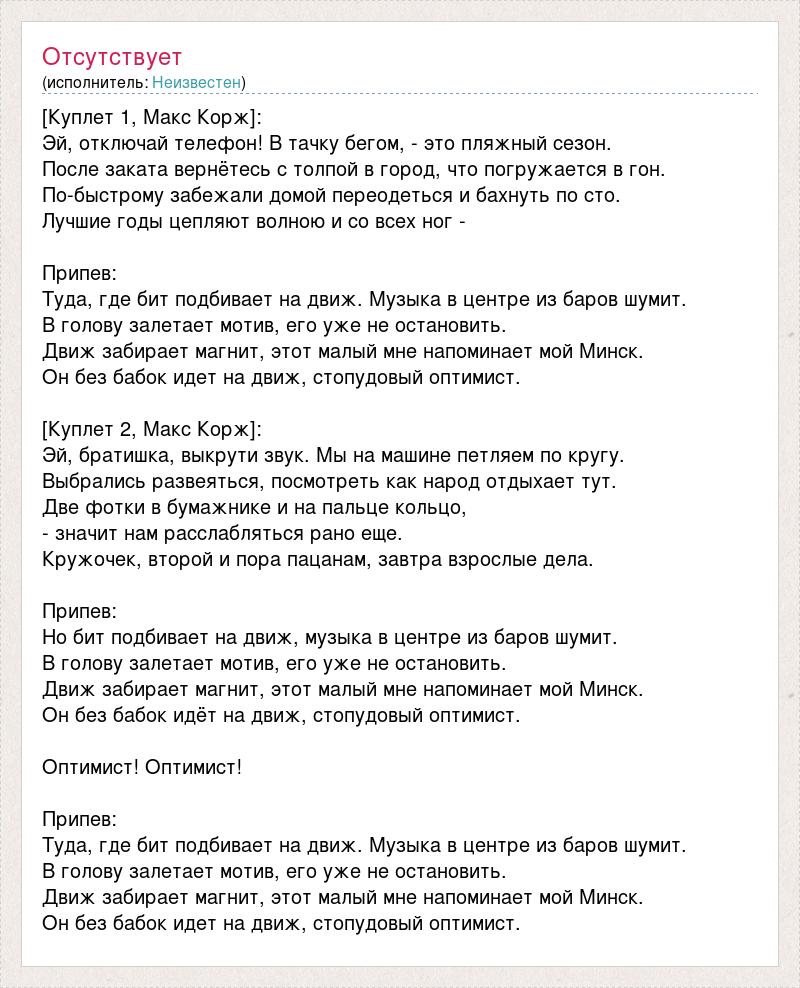 [Куплет 1, Макс Корж]: Эй, отключай телефон! В тачку бегом, - это пляжный сезон. После заката вернётесь с толпой в город, что погружается в гон. По-быстрому забежали домой переодеться и бахнуть по сто. Лучшие годы цепляют волною и со всех ног - Припев: Туда, где бит подбивает на движ. Музыка в центре из баров шумит. В голову залетает мотив, его уже не остановить. Движ забирает магнит, этот малый мне напоминает мой Минск. Он без бабок идет на движ, стопудовый оптимист. [Куплет 2, Макс Корж]: Эй, братишка, выкрути звук. Мы на машине петляем по кругу. Выбрались развеяться, посмотреть как народ отдыхает тут. Две фотки в бумажнике и на пальце кольцо, - значит нам расслабляться рано еще. Кружочек, второй и пора пацанам, завтра взрослые дела. Припев: Но бит подбивает на движ, музыка в центре из баров шумит. В голову залетает мотив, его уже не остановить. Движ забирает магнит, этот малый мне напоминает мой Минск. Он без бабок идёт на движ, стопудовый оптимист. Оптимист! Оптимист! Припев: Туда, где бит подбивает на движ. Музыка в центре из баров шумит. В голову залетает мотив, его уже не остановить. Движ забирает магнит, этот малый мне напоминает мой Минск. Он без бабок идет на движ, стопудовый оптимист.