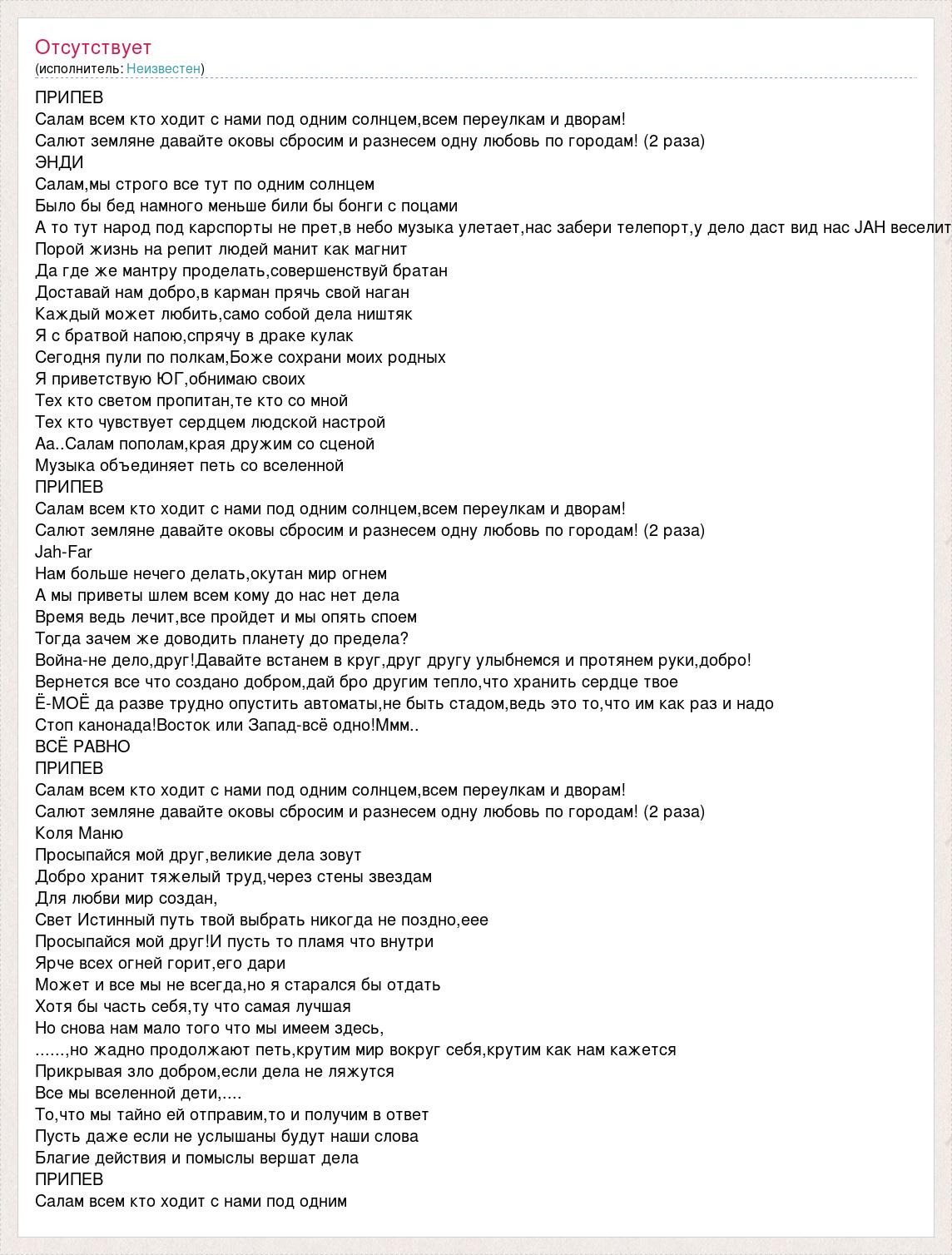 ПРИПЕВ Салам всем кто ходит с нами под одним солнцем,всем переулкам и дворам! Салют земляне давайте оковы сбросим и разнесем одну любовь по городам! (2 раза) ЭНДИ Салам,мы строго все тут по одним солнцем Было бы бед намного меньше били бы бонги с поцами А то тут народ под карспорты не прет,в небо музыка улетает,нас забери телепорт,у дело даст вид нас JAH веселит Порой жизнь на репит людей манит как магнит Да где же мантру проделать,совершенствуй братан Доставай нам добро,в карман прячь свой наган Каждый может любить,само собой дела ништяк Я с братвой напою,спрячу в драке кулак Сегодня пули по полкам,Боже сохрани моих родных Я приветствую ЮГ,обнимаю своих Тех кто светом пропитан,те кто со мной Тех кто чувствует сердцем людской настрой Аа..Салам пополам,края дружим со сценой Музыка объединяет петь со вселенной ПРИПЕВ Салам всем кто ходит с нами под одним солнцем,всем переулкам и дворам! Салют земляне давайте оковы сбросим и разнесем одну любовь по городам! (2 раза) Jah-Far Нам больше нечего делать,окутан мир огнем А мы приветы шлем всем кому до нас нет дела Время ведь лечит,все пройдет и мы опять споем Тогда зачем же доводить планету до предела? Война-не дело,друг!Давайте встанем в круг,друг другу улыбнемся и протянем руки,добро! Вернется все что создано добром,дай бро другим тепло,что хранить сердце твое Ё-МОЁ да разве трудно опустить автоматы,не быть стадом,ведь это то,что им как раз и надо Стоп канонада!Восток или Запад-всё одно!Ммм.. ВСЁ РАВНО ПРИПЕВ Салам всем кто ходит с нами под одним солнцем,всем переулкам и дворам! Салют земляне давайте оковы сбросим и разнесем одну любовь по городам! (2 раза) Коля Маню Просыпайся мой друг,великие дела зовут Добро хранит тяжелый труд,через стены звездам Для любви мир создан, Свет Истинный путь твой выбрать никогда не поздно,еее Просыпайся мой друг!И пусть то пламя что внутри Ярче всех огней горит,его дари Может и все мы не всегда,но я старался бы отдать Хотя бы часть себя,ту что самая лучшая Но снова нам мало того что мы имеем здесь, ......,но жадно продолжают петь,крутим мир вокруг себя,крутим как нам кажется Прикрывая зло добром,если дела не ляжутся Все мы вселенной дети,.... То,что мы тайно ей отправим,то и получим в ответ Пусть даже если не услышаны будут наши слова Благие действия и помыслы вершат дела ПРИПЕВ Салам всем кто ходит с нами под одним