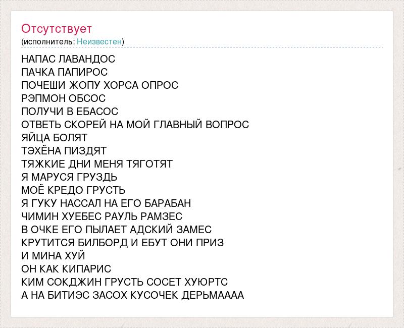 НАПАС ЛАВАНДОС ПАЧКА ПАПИРОС ПОЧЕШИ ЖОПУ ХОРСА ОПРОС РЭПМОН ОБСОС ПОЛУЧИ В ЕБАСОС ОТВЕТЬ СКОРЕЙ НА МОЙ ГЛАВНЫЙ ВОПРОС ЯЙЦА БОЛЯТ ТЭХЁНА ПИЗДЯТ ТЯЖКИЕ ДНИ МЕНЯ ТЯГОТЯТ Я МАРУСЯ ГРУЗДЬ МОЁ КРЕДО ГРУСТЬ Я ГУКУ НАССАЛ НА ЕГО БАРАБАН ЧИМИН ХУЕБЕС РАУЛЬ РАМЗЕС В ОЧКЕ ЕГО ПЫЛАЕТ АДСКИЙ ЗАМЕС КРУТИТСЯ БИЛБОРД И ЕБУТ ОНИ ПРИЗ И МИНА ХУЙ ОН КАК КИПАРИС КИМ СОКДЖИН ГРУСТЬ СОСЕТ ХУЮРТС А НА БИТИЭС ЗАСОХ КУСОЧЕК ДЕРЬМАААА