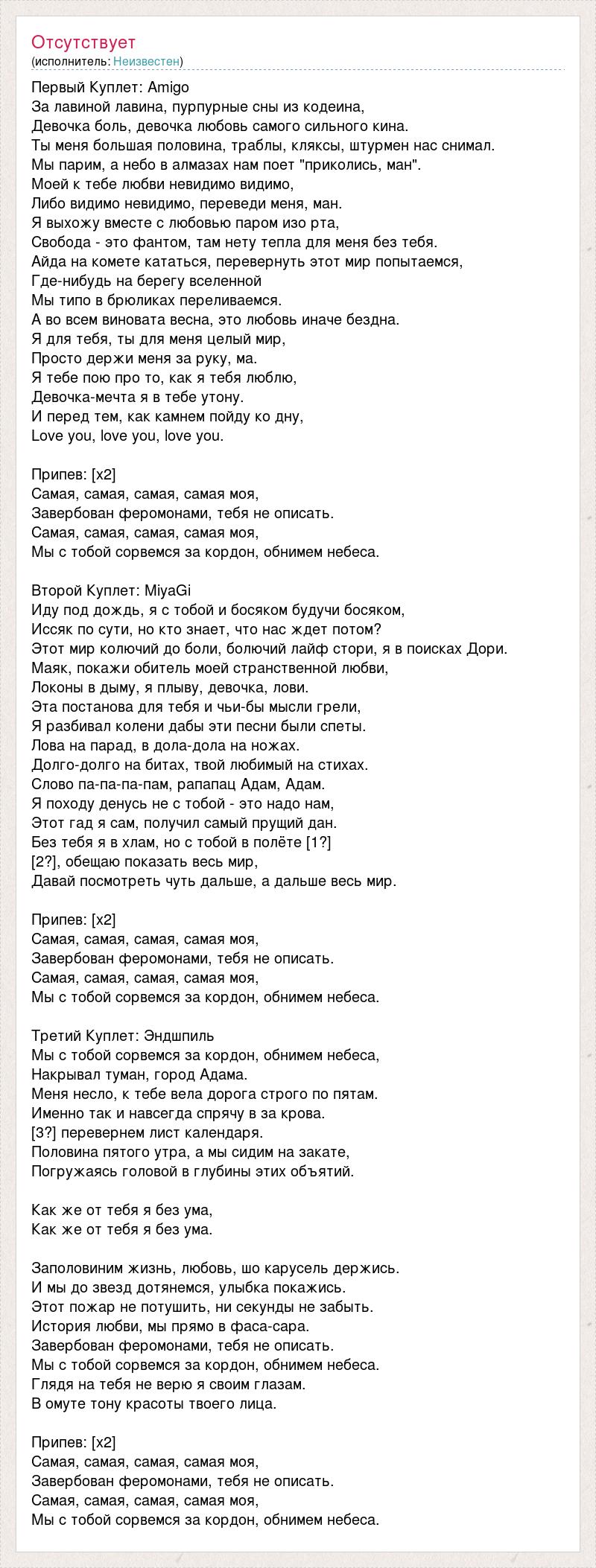 Первый Куплет: Amigo За лавиной лавина, пурпурные сны из кодеина, Девочка боль, девочка любовь самого сильного кина. Ты меня большая половина, траблы, кляксы, штурмен нас снимал. Мы парим, а небо в алмазах нам поет "приколись, ман". Моей к тебе любви невидимо видимо, Либо видимо невидимо, переведи меня, ман. Я выхожу вместе с любовью паром изо рта, Свобода - это фантом, там нету тепла для меня без тебя. Айда на комете кататься, перевернуть этот мир попытаемся, Где-нибудь на берегу вселенной Мы типо в брюликах переливаемся. А во всем виновата весна, это любовь иначе бездна. Я для тебя, ты для меня целый мир, Просто держи меня за руку, ма. Я тебе пою про то, как я тебя люблю, Девочка-мечта я в тебе утону. И перед тем, как камнем пойду ко дну, Love you, love you, love you. Припев: [х2] Самая, самая, самая, самая моя, Завербован феромонами, тебя не описать. Самая, самая, самая, самая моя, Мы с тобой сорвемся за кордон, обнимем небеса. Второй Куплет: MiyaGi Иду под дождь, я с тобой и босяком будучи босяком, Иссяк по сути, но кто знает, что нас ждет потом? Этот мир колючий до боли, болючий лайф стори, я в поисках Дори. Маяк, покажи обитель моей странственной любви, Локоны в дыму, я плыву, девочка, лови. Эта постанова для тебя и чьи-бы мысли грели, Я разбивал колени дабы эти песни были спеты. Лова на парад, в дола-дола на ножах. Долго-долго на битах, твой любимый на стихах. Слово па-па-па-пам, рапапац Адам, Адам. Я походу денусь не с тобой - это надо нам, Этот гад я сам, получил самый прущий дан. Без тебя я в хлам, но с тобой в полёте [1?] [2?], обещаю показать весь мир, Давай посмотреть чуть дальше, а дальше весь мир. Припев: [х2] Самая, самая, самая, самая моя, Завербован феромонами, тебя не описать. Самая, самая, самая, самая моя, Мы с тобой сорвемся за кордон, обнимем небеса. Третий Куплет: Эндшпиль Мы с тобой сорвемся за кордон, обнимем небеса, Накрывал туман, город Адама. Меня несло, к тебе вела дорога строго по пятам. Именно так и навсегда спрячу в за крова. [3?] перевернем лист календаря. Половина пятого утра, а мы сидим на закате, Погружаясь головой в глубины этих объятий. Как же от тебя я без ума, Как же от тебя я без ума. Заполовиним жизнь, любовь, шо карусель держись. И мы до звезд дотянемся, улыбка покажись. Этот пожар не потушить, ни секунды не забыть. История любви, мы прямо в фаса-сара. Завербован феромонами, тебя не описать. Мы с тобой сорвемся за кордон, обнимем небеса. Глядя на тебя не верю я своим глазам. В омуте тону красоты твоего лица. Припев: [х2] Самая, самая, самая, самая моя, Завербован феромонами, тебя не описать. Самая, самая, самая, самая моя, Мы с тобой сорвемся за кордон, обнимем небеса.