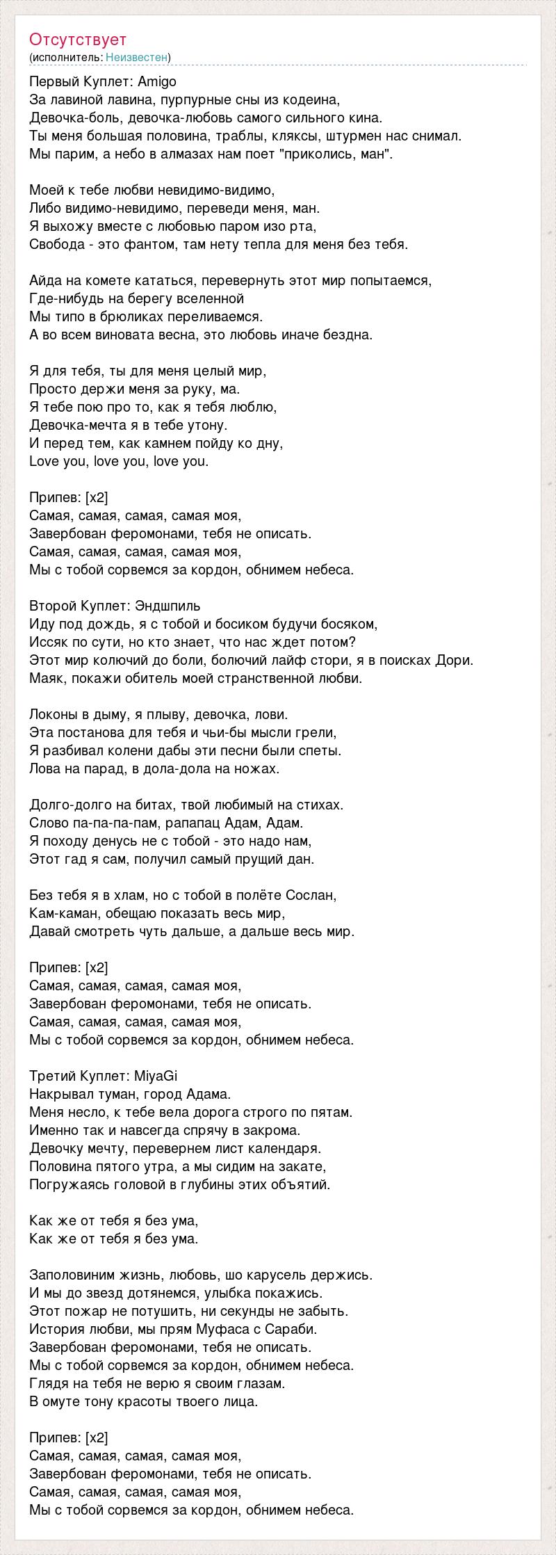 Первый Куплет: Amigo За лавиной лавина, пурпурные сны из кодеина, Девочка-боль, девочка-любовь самого сильного кина. Ты меня большая половина, траблы, кляксы, штурмен нас снимал. Мы парим, а небо в алмазах нам поет "приколись, ман". Моей к тебе любви невидимо-видимо, Либо видимо-невидимо, переведи меня, ман. Я выхожу вместе с любовью паром изо рта, Свобода - это фантом, там нету тепла для меня без тебя. Айда на комете кататься, перевернуть этот мир попытаемся, Где-нибудь на берегу вселенной Мы типо в брюликах переливаемся. А во всем виновата весна, это любовь иначе бездна. Я для тебя, ты для меня целый мир, Просто держи меня за руку, ма. Я тебе пою про то, как я тебя люблю, Девочка-мечта я в тебе утону. И перед тем, как камнем пойду ко дну, Love you, love you, love you. Припев: [х2] Самая, самая, самая, самая моя, Завербован феромонами, тебя не описать. Самая, самая, самая, самая моя, Мы с тобой сорвемся за кордон, обнимем небеса. Второй Куплет: Эндшпиль Иду под дождь, я с тобой и босиком будучи босяком, Иссяк по сути, но кто знает, что нас ждет потом? Этот мир колючий до боли, болючий лайф стори, я в поисках Дори. Маяк, покажи обитель моей странственной любви. Локоны в дыму, я плыву, девочка, лови. Эта постанова для тебя и чьи-бы мысли грели, Я разбивал колени дабы эти песни были спеты. Лова на парад, в дола-дола на ножах. Долго-долго на битах, твой любимый на стихах. Слово па-па-па-пам, рапапац Адам, Адам. Я походу денусь не с тобой - это надо нам, Этот гад я сам, получил самый прущий дан. Без тебя я в хлам, но с тобой в полёте Сослан, Кам-каман, обещаю показать весь мир, Давай смотреть чуть дальше, а дальше весь мир. Припев: [х2] Самая, самая, самая, самая моя, Завербован феромонами, тебя не описать. Самая, самая, самая, самая моя, Мы с тобой сорвемся за кордон, обнимем небеса. Третий Куплет: MiyaGi Накрывал туман, город Адама. Меня несло, к тебе вела дорога строго по пятам. Именно так и навсегда спрячу в закрома. Девочку мечту, перевернем лист календаря. Половина пятого утра, а мы сидим на закате, Погружаясь головой в глубины этих объятий. Как же от тебя я без ума, Как же от тебя я без ума. Заполовиним жизнь, любовь, шо карусель держись. И мы до звезд дотянемся, улыбка покажись. Этот пожар не потушить, ни секунды не забыть. История любви, мы прям Муфаса с Сараби. Завербован феромонами, тебя не описать. Мы с тобой сорвемся за кордон, обнимем небеса. Глядя на тебя не верю я своим глазам. В омуте тону красоты твоего лица. Припев: [х2] Самая, самая, самая, самая моя, Завербован феромонами, тебя не описать. Самая, самая, самая, самая моя, Мы с тобой сорвемся за кордон, обнимем небеса.