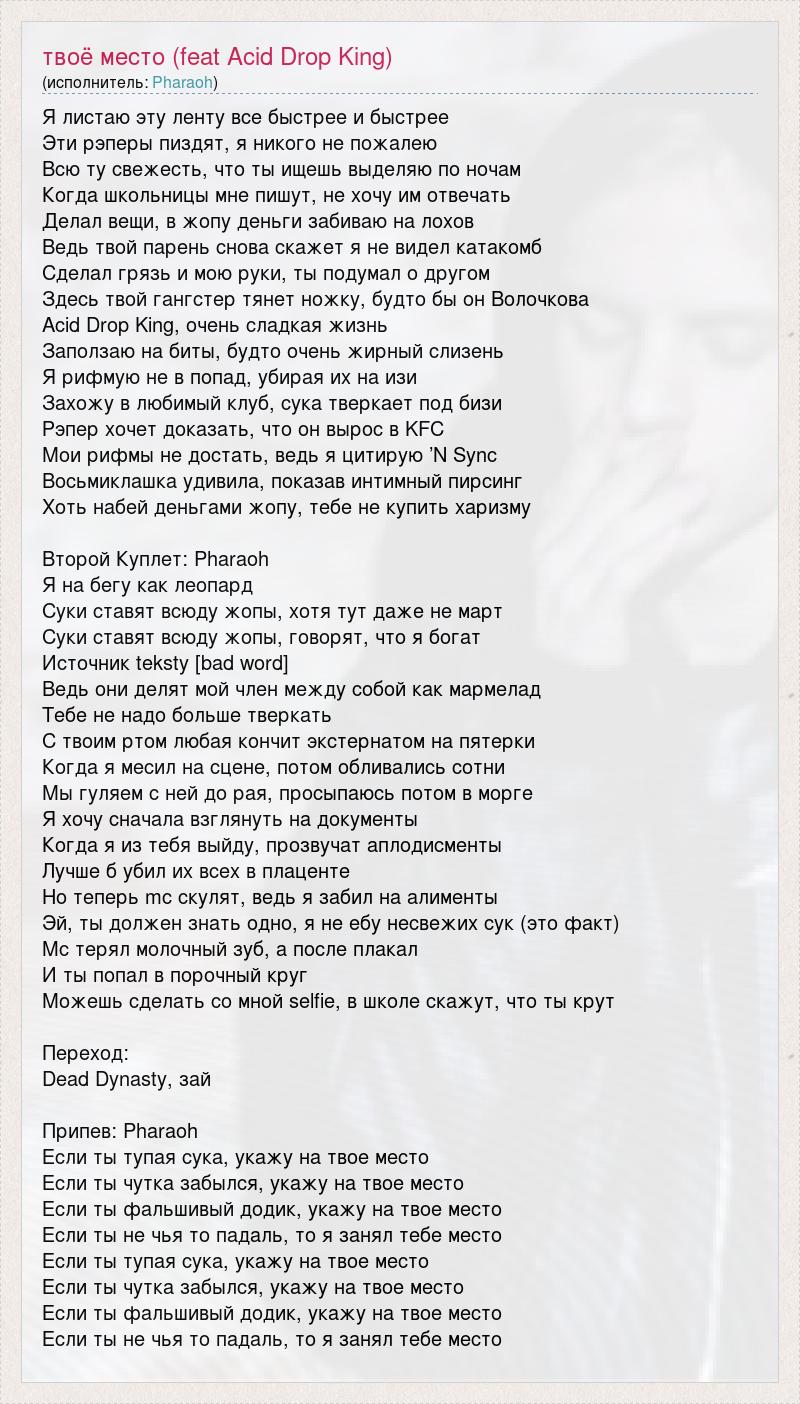 Я листаю эту ленту все быстрее и быстрее Эти рэперы пиздят, я никого не пожалею Всю ту свежесть, что ты ищешь выделяю по ночам Когда школьницы мне пишут, не хочу им отвечать Делал вещи, в жопу деньги забиваю на лохов Ведь твой парень снова скажет я не видел катакомб Сделал грязь и мою руки, ты подумал о другом Здесь твой гангстер тянет ножку, будто бы он Волочкова Acid Drop King, очень сладкая жизнь Заползаю на биты, будто очень жирный слизень Я рифмую не в попад, убирая их на изи Захожу в любимый клуб, сука тверкает под бизи Рэпер хочет доказать, что он вырос в KFC Мои рифмы не достать, ведь я цитирую ’N Sync Восьмиклашка удивила, показав интимный пирсинг Хоть набей деньгами жопу, тебе не купить харизму Второй Куплет: Pharaoh Я на бегу как леопард Суки ставят всюду жопы, хотя тут даже не март Суки ставят всюду жопы, говорят, что я богат Источник teksty [bad word] Ведь они делят мой член между собой как мармелад Тебе не надо больше тверкать С твоим ртом любая кончит экстернатом на пятерки Когда я месил на сцене, потом обливались сотни Мы гуляем с ней до рая, просыпаюсь потом в морге Я хочу сначала взглянуть на документы Когда я из тебя выйду, прозвучат аплодисменты Лучше б убил их всех в плаценте Но теперь mc скулят, ведь я забил на алименты Эй, ты должен знать одно, я не ебу несвежих сук (это факт) Mc терял молочный зуб, а после плакал И ты попал в порочный круг Можешь сделать со мной selfie, в школе скажут, что ты крут Переход: Dead Dynasty, зай Припев: Pharaoh Если ты тупая сука, укажу на твое место Если ты чутка забылся, укажу на твое место Если ты фальшивый додик, укажу на твое место Если ты не чья то падаль, то я занял тебе место Если ты тупая сука, укажу на твое место Если ты чутка забылся, укажу на твое место Если ты фальшивый додик, укажу на твое место Если ты не чья то падаль, то я занял тебе место