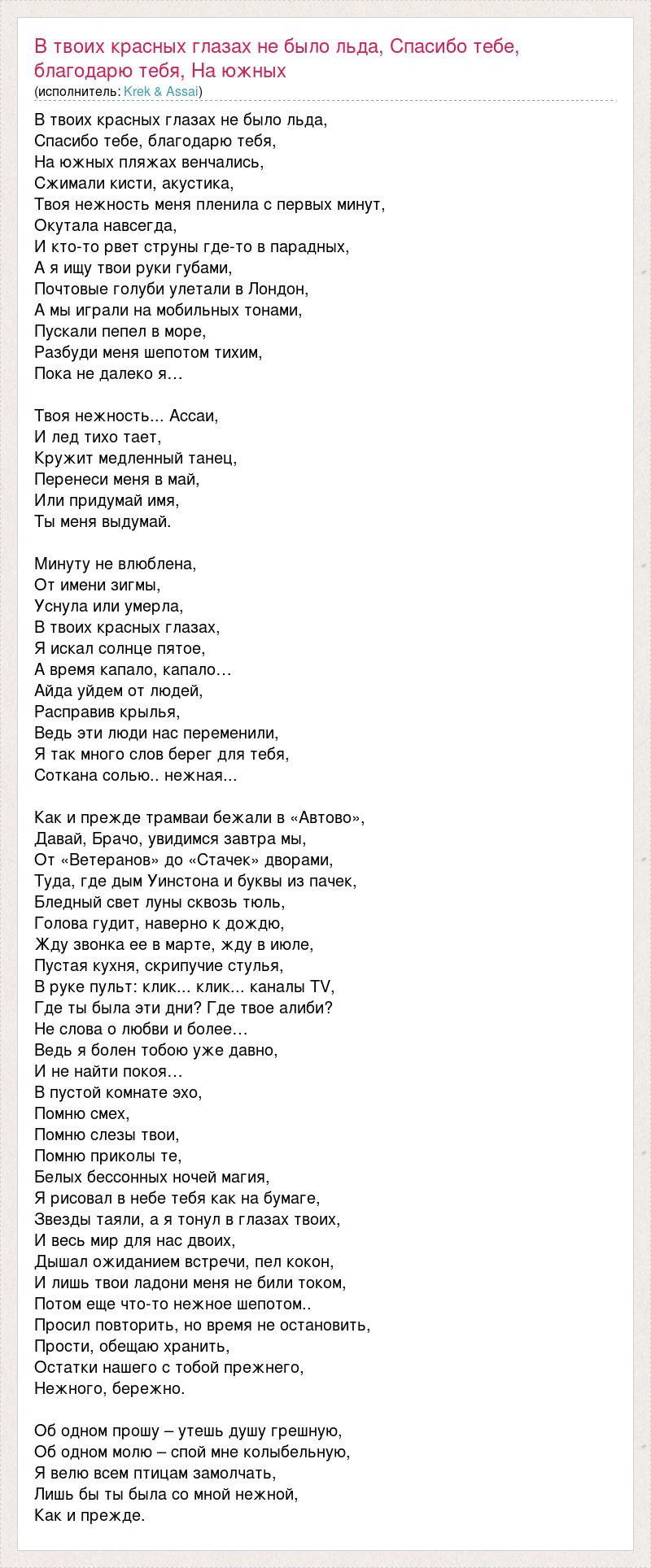 В твоих красных глазах не было льда, Спасибо тебе, благодарю тебя, На южных пляжах венчались, Сжимали кисти, акустика, Твоя нежность меня пленила с первых минут, Окутала навсегда, И кто-то рвет струны где-то в парадных, А я ищу твои руки губами, Почтовые голуби улетали в Лондон, А мы играли на мобильных тонами, Пускали пепел в море, Разбуди меня шепотом тихим, Пока не далеко я… Твоя нежность... Ассаи, И лед тихо тает, Кружит медленный танец, Перенеси меня в май, Или придумай имя, Ты меня выдумай. Минуту не влюблена, От имени зигмы, Уснула или умерла, В твоих красных глазах, Я искал солнце пятое, А время капало, капало… Айда уйдем от людей, Расправив крылья, Ведь эти люди нас переменили, Я так много слов берег для тебя, Соткана солью.. нежная... Как и прежде трамваи бежали в «Автово», Давай, Брачо, увидимся завтра мы, От «Ветеранов» до «Стачек» дворами, Туда, где дым Уинстона и буквы из пачек, Бледный свет луны сквозь тюль, Голова гудит, наверно к дождю, Жду звонка ее в марте, жду в июле, Пустая кухня, скрипучие стулья, В руке пульт: клик... клик... каналы TV, Где ты была эти дни? Где твое алиби? Не слова о любви и более… Ведь я болен тобою уже давно, И не найти покоя… В пустой комнате эхо, Помню смех, Помню слезы твои, Помню приколы те, Белых бессонных ночей магия, Я рисовал в небе тебя как на бумаге, Звезды таяли, а я тонул в глазах твоих, И весь мир для нас двоих, Дышал ожиданием встречи, пел кокон, И лишь твои ладони меня не били током, Потом еще что-то нежное шепотом.. Просил повторить, но время не остановить, Прости, обещаю хранить, Остатки нашего с тобой прежнего, Нежного, бережно. Об одном прошу – утешь душу грешную, Об одном молю – спой мне колыбельную, Я велю всем птицам замолчать, Лишь бы ты была со мной нежной, Как и прежде.