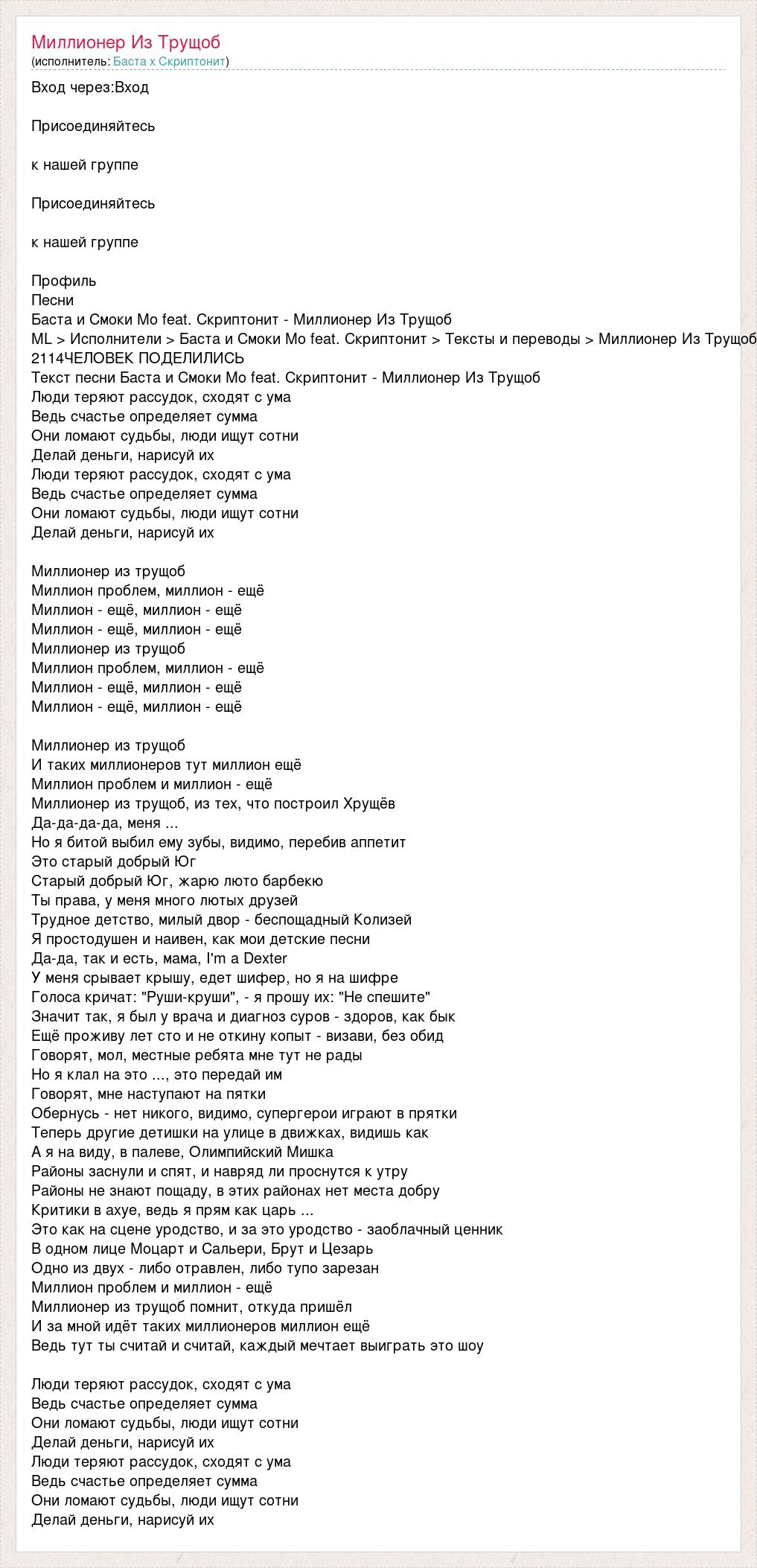 Вход через:Вход Присоединяйтесь к нашей группе Присоединяйтесь к нашей группе Профиль Песни Баста и Смоки Мо feat. Скриптонит - Миллионер Из Трущоб ML > Исполнители > Баста и Смоки Мо feat. Скриптонит > Тексты и переводы > Миллионер Из Трущоб 2114ЧЕЛОВЕК ПОДЕЛИЛИСЬ Текст песни Баста и Смоки Мо feat. Скриптонит - Миллионер Из Трущоб Люди теряют рассудок, сходят с ума Ведь счастье определяет сумма Они ломают судьбы, люди ищут сотни Делай деньги, нарисуй их Люди теряют рассудок, сходят с ума Ведь счастье определяет сумма Они ломают судьбы, люди ищут сотни Делай деньги, нарисуй их Миллионер из трущоб Миллион проблем, миллион - ещё Миллион - ещё, миллион - ещё Миллион - ещё, миллион - ещё Миллионер из трущоб Миллион проблем, миллион - ещё Миллион - ещё, миллион - ещё Миллион - ещё, миллион - ещё Миллионер из трущоб И таких миллионеров тут миллион ещё Миллион проблем и миллион - ещё Миллионер из трущоб, из тех, что построил Хрущёв Да-да-да-да, меня ... Но я битой выбил ему зубы, видимо, перебив аппетит Это старый добрый Юг Старый добрый Юг, жарю люто барбекю Ты права, у меня много лютых друзей Трудное детство, милый двор - беспощадный Колизей Я простодушен и наивен, как мои детские песни Да-да, так и есть, мама, I'm a Dexter У меня срывает крышу, едет шифер, но я на шифре Голоса кричат: "Руши-круши", - я прошу их: "Не спешите" Значит так, я был у врача и диагноз суров - здоров, как бык Ещё проживу лет сто и не откину копыт - визави, без обид Говорят, мол, местные ребята мне тут не рады Но я клал на это ..., это передай им Говорят, мне наступают на пятки Обернусь - нет никого, видимо, супергерои играют в прятки Теперь другие детишки на улице в движках, видишь как А я на виду, в палеве, Олимпийский Мишка Районы заснули и спят, и навряд ли проснутся к утру Районы не знают пощаду, в этих районах нет места добру Критики в ахуе, ведь я прям как царь ... Это как на сцене уродство, и за это уродство - заоблачный ценник В одном лице Моцарт и Сальери, Брут и Цезарь Одно из двух - либо отравлен, либо тупо зарезан Миллион проблем и миллион - ещё Миллионер из трущоб помнит, откуда пришёл И за мной идёт таких миллионеров миллион ещё Ведь тут ты считай и считай, каждый мечтает выиграть это шоу Люди теряют рассудок, сходят с ума Ведь счастье определяет сумма Они ломают судьбы, люди ищут сотни Делай деньги, нарисуй их Люди теряют рассудок, сходят с ума Ведь счастье определяет сумма Они ломают судьбы, люди ищут сотни Делай деньги, нарисуй их