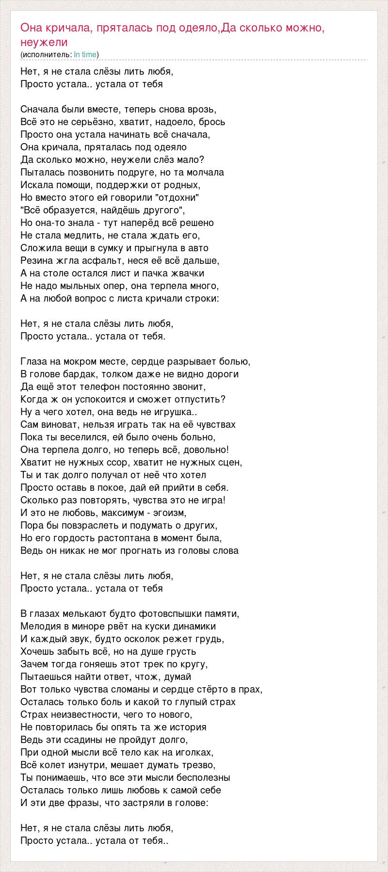 Нет, я не стала слёзы лить любя, Просто устала.. устала от тебя Сначала были вместе, теперь снова врозь, Всё это не серьёзно, хватит, надоело, брось Просто она устала начинать всё сначала, Она кричала, пряталась под одеяло Да сколько можно, неужели слёз мало? Пыталась позвонить подруге, но та молчала Искала помощи, поддержки от родных, Но вместо этого ей говорили "отдохни" "Всё образуется, найдёшь другого", Но она-то знала - тут наперёд всё решено Не стала медлить, не стала ждать его, Сложила вещи в сумку и прыгнула в авто Резина жгла асфальт, неся её всё дальше, А на столе остался лист и пачка жвачки Не надо мыльных опер, она терпела много, А на любой вопрос с листа кричали строки: Нет, я не стала слёзы лить любя, Просто устала.. устала от тебя. Глаза на мокром месте, сердце разрывает болью, В голове бардак, толком даже не видно дороги Да ещё этот телефон постоянно звонит, Когда ж он успокоится и сможет отпустить? Ну а чего хотел, она ведь не игрушка.. Сам виноват, нельзя играть так на её чувствах Пока ты веселился, ей было очень больно, Она терпела долго, но теперь всё, довольно! Хватит не нужных ссор, хватит не нужных сцен, Ты и так долго получал от неё что хотел Просто оставь в покое, дай ей прийти в себя. Сколько раз повторять, чувства это не игра! И это не любовь, максимум - эгоизм, Пора бы повзраслеть и подумать о других, Но его гордость растоптана в момент была, Ведь он никак не мог прогнать из головы слова Нет, я не стала слёзы лить любя, Просто устала.. устала от тебя В глазах мелькают будто фотовспышки памяти, Мелодия в миноре рвёт на куски динамики И каждый звук, будто осколок режет грудь, Хочешь забыть всё, но на душе грусть Зачем тогда гоняешь этот трек по кругу, Пытаешься найти ответ, чтож, думай Вот только чувства сломаны и сердце стёрто в прах, Осталась только боль и какой то глупый страх Страх неизвестности, чего то нового, Не повторилась бы опять та же история Ведь эти ссадины не пройдут долго, При одной мысли всё тело как на иголках, Всё колет изнутри, мешает думать трезво, Ты понимаешь, что все эти мысли бесполезны Осталась только лишь любовь к самой себе И эти две фразы, что застряли в голове: Нет, я не стала слёзы лить любя, Просто устала.. устала от тебя..