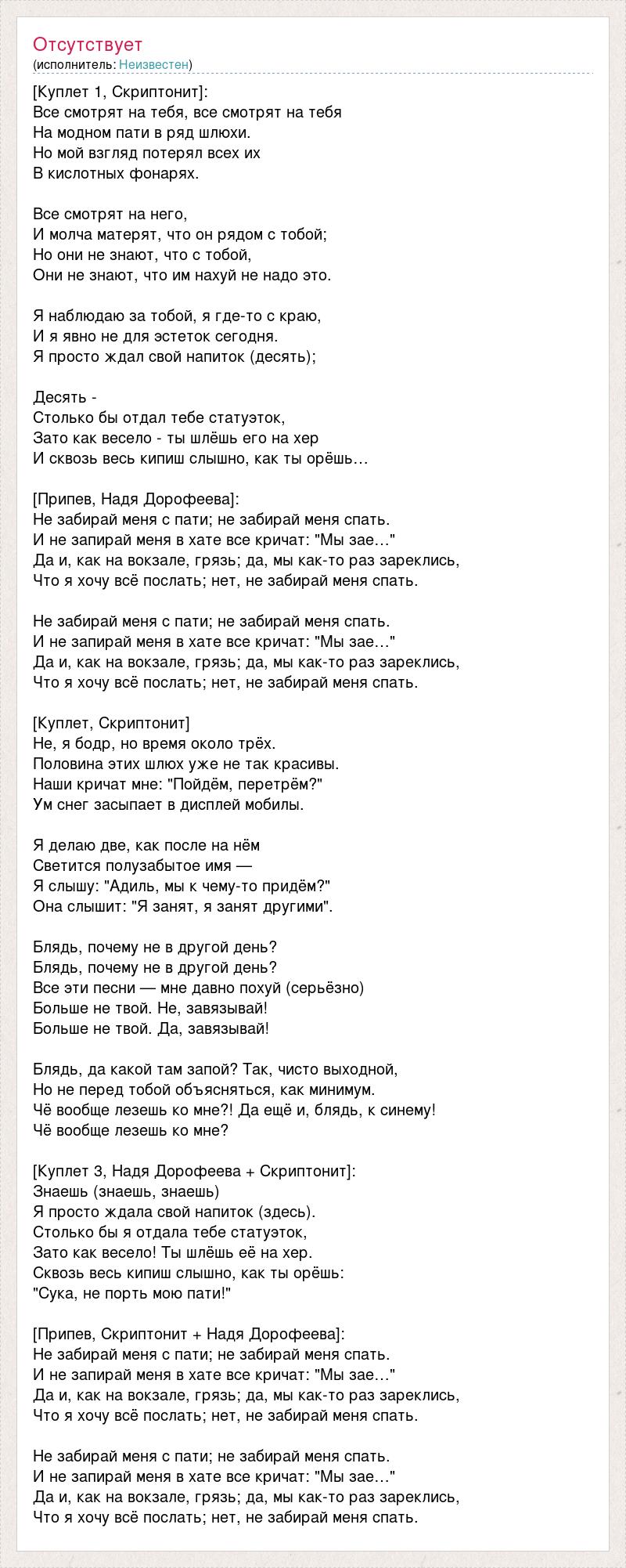 [Куплет 1, Скриптонит]: Все смотрят на тебя, все смотрят на тебя На модном пати в ряд шлюхи. Но мой взгляд потерял всех их В кислотных фонарях. Все смотрят на него, И молча матерят, что он рядом с тобой; Но они не знают, что с тобой, Они не знают, что им нахуй не надо это. Я наблюдаю за тобой, я где-то с краю, И я явно не для эстеток сегодня. Я просто ждал свой напиток (десять); Десять - Столько бы отдал тебе статуэток, Зато как весело - ты шлёшь его на хер И сквозь весь кипиш слышно, как ты орёшь… [Припев, Надя Дорофеева]: Не забирай меня с пати; не забирай меня спать. И не запирай меня в хате все кричат: "Мы зае…" Да и, как на вокзале, грязь; да, мы как-то раз зареклись, Что я хочу всё послать; нет, не забирай меня спать. Не забирай меня с пати; не забирай меня спать. И не запирай меня в хате все кричат: "Мы зае…" Да и, как на вокзале, грязь; да, мы как-то раз зареклись, Что я хочу всё послать; нет, не забирай меня спать. [Куплет, Скриптонит] Не, я бодр, но время около трёх. Половина этих шлюх уже не так красивы. Наши кричат мне: "Пойдём, перетрём?" Ум снег засыпает в дисплей мобилы. Я делаю две, как после на нём Светится полузабытое имя — Я слышу: "Адиль, мы к чему-то придём?" Она слышит: "Я занят, я занят другими". Блядь, почему не в другой день? Блядь, почему не в другой день? Все эти песни — мне давно похуй (серьёзно) Больше не твой. Не, завязывай! Больше не твой. Да, завязывай! Блядь, да какой там запой? Так, чисто выходной, Но не перед тобой объясняться, как минимум. Чё вообще лезешь ко мне?! Да ещё и, блядь, к синему! Чё вообще лезешь ко мне? [Куплет 3, Надя Дорофеева + Скриптонит]: Знаешь (знаешь, знаешь) Я просто ждала свой напиток (здесь). Столько бы я отдала тебе статуэток, Зато как весело! Ты шлёшь её на хер. Сквозь весь кипиш слышно, как ты орёшь: "Сука, не порть мою пати!" [Припев, Скриптонит + Надя Дорофеева]: Не забирай меня с пати; не забирай меня спать. И не запирай меня в хате все кричат: "Мы зае…" Да и, как на вокзале, грязь; да, мы как-то раз зареклись, Что я хочу всё послать; нет, не забирай меня спать. Не забирай меня с пати; не забирай меня спать. И не запирай меня в хате все кричат: "Мы зае…" Да и, как на вокзале, грязь; да, мы как-то раз зареклись, Что я хочу всё послать; нет, не забирай меня спать.