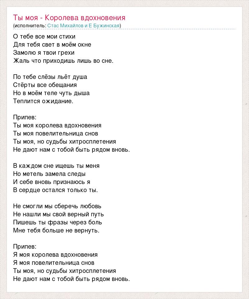 О тебе все мои стихи Для тебя свет в моём окне Замолю я твои грехи Жаль что приходишь лишь во сне. По тебе слёзы льёт душа Стёрты все обещания Но в моём теле чуть дыша Теплится ожидание. Припев: Ты моя королева вдохновения Ты моя повелительница снов Ты моя, но судьбы хитросплетения Не дают нам с тобой быть рядом вновь. В каждом сне ищешь ты меня Но метель замела следы И себе вновь признаюсь я В сердце остался только ты. Не смогли мы сберечь любовь Не нашли мы свой верный путь Пишешь ты фразы через боль Мне тебя больше не вернуть. Припев: Я моя королева вдохновения Я моя повелительница снов Ты моя, но судьбы хитросплетения Не дают нам с тобой быть рядом вновь.