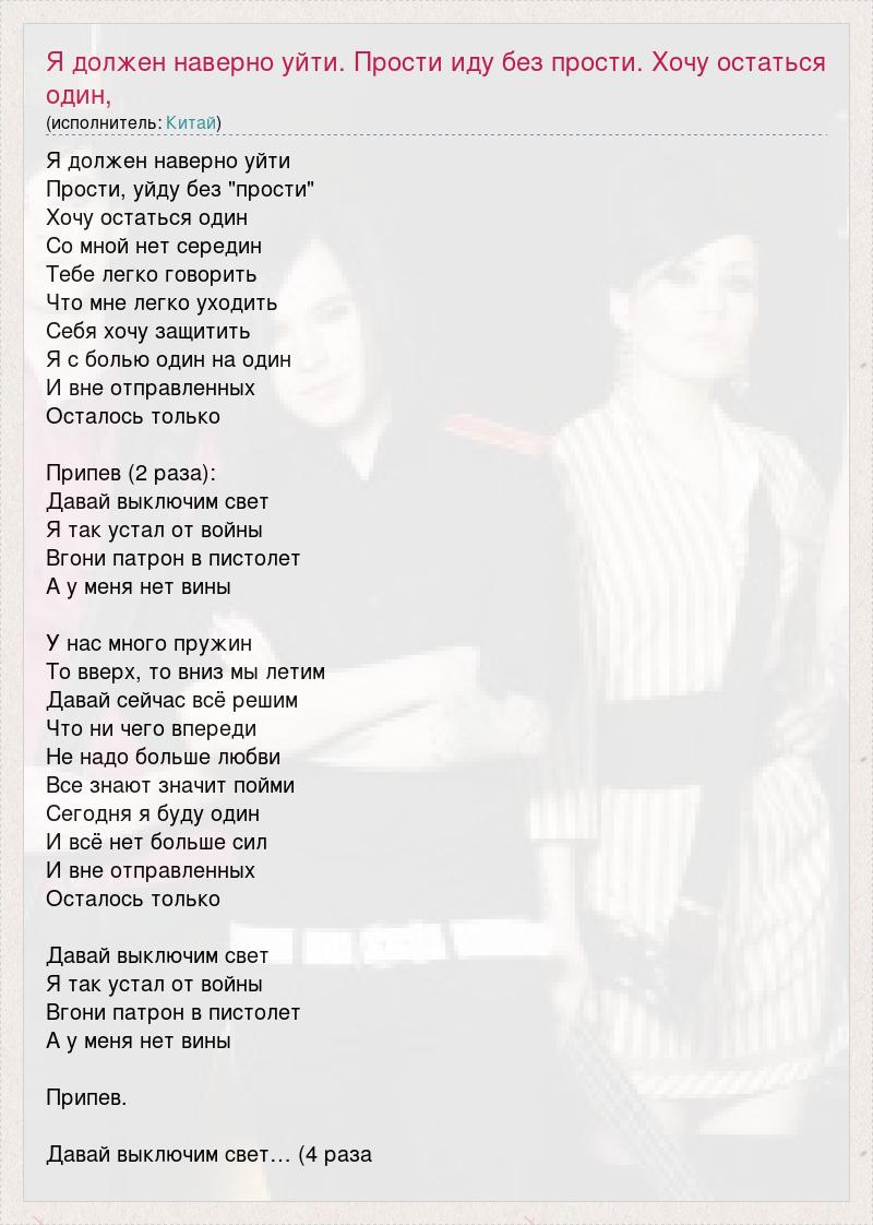 Я должен наверно уйти Прости, уйду без "прости" Хочу остаться один Со мной нет середин Тебе легко говорить Что мне легко уходить Себя хочу защитить Я c болью один на один И вне отправленных Осталось только Припев (2 раза): Давай выключим свет Я так устал от войны Вгони патрон в пистолет А у меня нет вины У нас много пружин То вверх, то вниз мы летим Давай сейчас всё решим Что ни чего впереди Не надо больше любви Все знают значит пойми Сегодня я буду один И всё нет больше сил И вне отправленных Осталось только Давай выключим свет Я так устал от войны Вгони патрон в пистолет А у меня нет вины Припев. Давай выключим свет… (4 раза