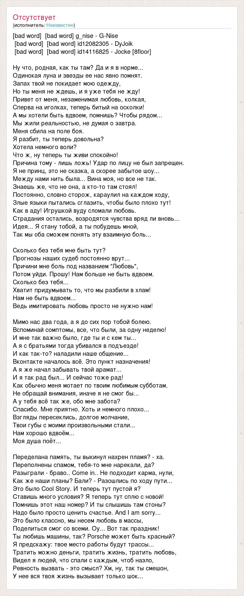 [bad word] [bad word] g_nise - G-Nise [bad word] [bad word] id12082305 - DyJoik [bad word] [bad word] id14116825 - Jocke [8floor] Ну что, родная, как ты там? Да и я в норме... Одинокая луна и звезды ее нас явно помнят. Запах твой не покидает мою одежду, Но ты меня не ждешь, и я уже тебя не жду! Привет от меня, незаменимая любовь, колкая, Сперва на иголках, теперь битый на осколки! А мы хотели быть вдвоем, помнишь? Чтобы рядом... Мы жили реальностью, не думая о завтра. Меня сбила на поле боя. Я разбит, ты теперь довольна? Хотела немного воли? Что ж, ну теперь ты живи спокойно! Причина тому - лишь ложь! Удар по лицу не был запрещен. Я не принц, это не сказка, а скорее забытое шоу... Между нами нить была... Вина моя, но все не так. Знаешь же, что не она, а кто-то там стоял! Постоянно, словно сторож, караулил на каждом ходу, Злые языки пытались сглазить, чтобы было плохо тут! Как в аду! Игрушкой вуду сломали любовь. Страдания остались, возродятся чувства вряд ли вновь... Идея... Я стану тобой, а ты побудешь мной, Так мы оба сможем понять эту взаимную боль... Сколько без тебя мне быть тут? Прогнозы наших судеб постоянно врут... Причини мне боль под названием "Любовь", Потом уйди. Прошу! Нам больше не быть вдвоем. Сколько без тебя... Хватит придумывать то, что мы разбили в хлам! Нам не быть вдвоем... Ведь имитировать любовь просто не нужно нам! Мимо нас два года, а я до сих пор тобой болею. Вспоминай сомптомы, все, что были, за одну неделю! И мне так важно было, где ты и с кем ты... А я с братьями тогда убивался в подъезде! И как так-то? наладили наше общение... Вконтакте началось всё. Это пункт назначения! А я же начал забывать твой арамат... И я так рад был... И сейчас тоже рад! Как обычно меня мотает по твоим любимым субботам. Не обращай внимания, иначе я не смог бы... А у тебя всё так же, обо мне забота? Спасибо. Мне приятно. Хоть и немного плохо... Взгляды пересеклись, долгое молчание, Твои губы с моими произвольными стали... Нам хорошо вдвоём... Моя душа поёт... Переделана память, ты выкинул нахрен пламя? - ха. Переполнены спамом, тебя-то мне нарекали, да? Разыграли - браво.. Come in.. Не подходит карма, нули, Как же наши планы? Бали? - Разошлись по ходу пути... Это было Cool Story. И теперь тут пустой я? Ставишь много условия? Я теперь тут сплю с новой! Помнишь этот наш номер? И ты слышишь там стоны? Надо было просто ценить счастье. And I am sorry... Это было классно, мы несем любовь в массы, Поделиться смог со всеми. Оу... Вот так праздник! Ты любишь машины, так? Porsche может быть красный? Я предскажу: твое место работы будут трассы... Тратить можно деньги, тратить жизнь, тратить любовь, Видел я людей, что спали с каждым, чтоб назло, Ревность вызвать - это смысл? Хм, ну, так ты смешон, У нее вся твоя жизнь вызывает только шок...