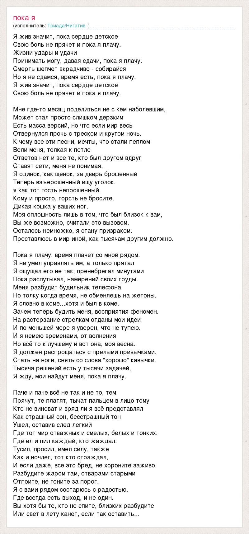 Я жив значит, пока сердце детское Свою боль не прячет и пока я плачу. Жизни удары и удачи Принимать могу, давая сдачи, пока я плачу. Смерть шепчет вкрадчиво - собирайся Но я не сдамся, время есть, пока я плачу. Я жив значит, пока сердце детское Свою боль не прячет и пока я плачу. Мне где-то месяц поделиться не с кем наболевшим, Может стал просто слишком дерзким Есть масса версий, но что если мир весь Отвернулся прочь с треском и кругом ночь. К чему все эти песни, мечты, что стали пеплом Вели меня, толкая к петле Ответов нет и все те, кто был другом вдруг Ставят сети, меня не понимая. Я одинок, как щенок, за дверь брошенный Теперь взъерошенный ищу уголок. я как тот гость непрошенный. Кому и просто, горсть не бросите. Дикая кошка у ваших ног. Моя оплошность лишь в том, что был близок к вам, Вы же возможно, считали это вызовом. Осталось немножко, я стану призраком. Преставлюсь в мир иной, как тысячам другим должно. Пока я плачу, время плачет со мной рядом. Я не умел управлять им, а только прятал Я ощущал его не так, пренебрегал минутами Пока распутывал, намерений своих груды. Меня разбудит будильник телефона Но толку когда время, не обменяешь на жетоны. Я словно в коме...хотя и был в коме. Зачем теперь будить меня, восприятия феномен. На растерзание стрелкам отданы мои идеи И по меньшей мере я уверен, что не тупею. И я немею временами, от волнения Но всё то к лучшему и вот она, моя весна. Я должен распрощаться с прелыми привычками. Стать на ноги, снять со слова "хорошо" кавычки. Тысяча решений есть у тысячи задачей, Я жду, мои найдут меня, пока я плачу. Паче и паче всё не так и не то, тем Прячут, те платят, тычат пальцем в лицо тому Кто не виноват и вряд ли я всё представлял Как страшный сон, бесстрашный тон Ушел, оставив след легкий Где тот мир отважных и смелых, белых и тонких. Где ел и пил каждый, кто жаждал. Тусил, просил, имел силу, также Как и ночлег, тот кто страждал, И если даже, всё это бред, не хороните заживо. Разбудите жаром там, отварами старыми Отпоите, не гоните за порог. Я с вами рядом состарюсь с радостью. Где всегда есть выход, и не один. Вы хотя бы те, кто не спите, близких разбудите Или свет в лету канет, если так оставить...
