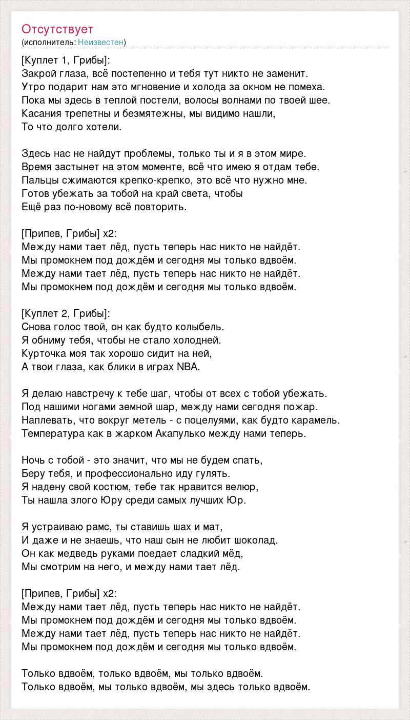 [Куплет 1, Грибы]: Закрой глаза, всё постепенно и тебя тут никто не заменит. Утро подарит нам это мгновение и холода за окном не помеха. Пока мы здесь в теплой постели, волосы волнами по твоей шее. Касания трепетны и безмятежны, мы видимо нашли, То что долго хотели. Здесь нас не найдут проблемы, только ты и я в этом мире. Время застынет на этом моменте, всё что имею я отдам тебе. Пальцы сжимаются крепко-крепко, это всё что нужно мне. Готов убежать за тобой на край света, чтобы Ещё раз по-новому всё повторить. [Припев, Грибы] x2: Между нами тает лёд, пусть теперь нас никто не найдёт. Мы промокнем под дождём и сегодня мы только вдвоём. Между нами тает лёд, пусть теперь нас никто не найдёт. Мы промокнем под дождём и сегодня мы только вдвоём. [Куплет 2, Грибы]: Снова голос твой, он как будто колыбель. Я обниму тебя, чтобы не стало холодней. Курточка моя так хорошо сидит на ней, А твои глаза, как блики в играх NBA. Я делаю навстречу к тебе шаг, чтобы от всех с тобой убежать. Под нашими ногами земной шар, между нами сегодня пожар. Наплевать, что вокруг метель - с поцелуями, как будто карамель. Температура как в жарком Акапулько между нами теперь. Ночь с тобой - это значит, что мы не будем спать, Беру тебя, и профессионально иду гулять. Я надену свой костюм, тебе так нравится велюр, Ты нашла злого Юру среди самых лучших Юр. Я устраиваю рамс, ты ставишь шах и мат, И даже и не знаешь, что наш сын не любит шоколад. Он как медведь руками поедает сладкий мёд, Мы смотрим на него, и между нами тает лёд. [Припев, Грибы] x2: Между нами тает лёд, пусть теперь нас никто не найдёт. Мы промокнем под дождём и сегодня мы только вдвоём. Между нами тает лёд, пусть теперь нас никто не найдёт. Мы промокнем под дождём и сегодня мы только вдвоём. Только вдвоём, только вдвоём, мы только вдвоём. Только вдвоём, мы только вдвоём, мы здесь только вдвоём.