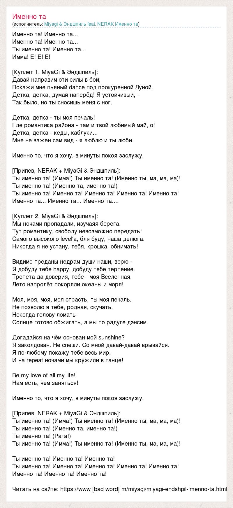 Именно та! Именно та... Именно та! Именно та... Ты именно та! Именно та... Имма! Е! Е! Е! [Куплет 1, MiyaGi & Эндшпиль]: Давай направим эти силы в бой, Покажи мне пьяный dаnce под прокуренной Луной. Детка, детка, думай наперёд! Я устойчивый, - Так было, но ты сносишь меня с ног. Детка, детка - ты моя печаль! Где романтика района - там и твой любимый май, о! Детка, детка - кеды, каблуки... Мне не важен сам вид - я люблю и ты люби. Именно то, что я хочу, в минуты покоя заслужу. [Припев, NERAK + MiyaGi & Эндшпиль]: Ты именно та! (Имма!) Ты именно та! (Именно ты, ма, ма, ма)! Ты именно та! (Именно та, именно та!) Ты именно та! Именно та! Именно та! Именно та! Именно та! Именно та... Именно та... Именно та.... [Куплет 2, MiyaGi & Эндшпиль]: Мы ночами пропадали, изучаяя берега. Тут романтику, свободу невозможно передать! Самого высокого level'а, бля буду, наша делюга. Никогда я не устану, тебя, крошка, обнимать! Видимо преданы недрам души наши, верю - Я добуду тебе happy, добуду тебе терпение. Трепета да доверия, тебе - моя Вселенная. Лето напролёт покоряли океаны и моря! Моя, моя, моя, моя страсть, ты моя печаль. Не позволю я тебе, родная, скучать. Некогда голову ломать - Солнце готово обжигать, а мы по радуге дэнсим. Догадайся на чём основан мой sunshine? Я заколдован. Не спеши. Со мной давай-давай врывайся. Я по-любому покажу тебе весь мир, И на repeat ночами мы кружили в танце! Be my love of all my life! Нам есть, чем заняться! Именно то, что я хочу, в минуты покоя заслужу. [Припев, NERAK + MiyaGi & Эндшпиль]: Ты именно та! (Имма!) Ты именно та! (Именно ты, ма, ма, ма)! Ты именно та! (Именно та, именно та!) Ты именно та! (Рага!) Ты именно та! (Имма!) Ты именно та! (Именно ты, ма, ма, ма)! Ты именно та! Именно та! Именно та! Ты именно та! Именно та! Именно та! Именно та! Именно та! Именно та! Именно та! Именно та! Читать на сайте: https://www [bad word] m/miyagi/miyagi-endshpil-imenno-ta.html