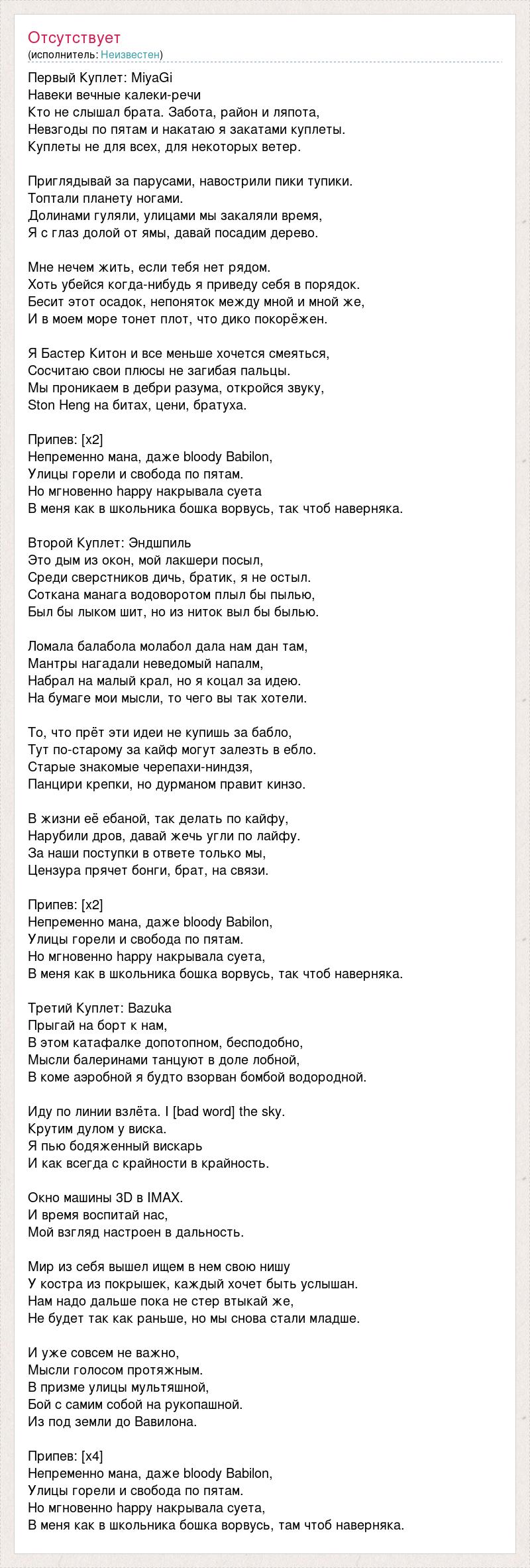 Первый Куплет: MiyaGi Навеки вечные калеки-речи Кто не слышал брата. Забота, район и ляпота, Невзгоды по пятам и накатаю я закатами куплеты. Куплеты не для всех, для некоторых ветер. Приглядывай за парусами, навострили пики тупики. Топтали планету ногами. Долинами гуляли, улицами мы закаляли время, Я с глаз долой от ямы, давай посадим дерево. Мне нечем жить, если тебя нет рядом. Хоть убейся когда-нибудь я приведу себя в порядок. Бесит этот осадок, непоняток между мной и мной же, И в моем море тонет плот, что дико покорёжен. Я Бастер Китон и все меньше хочется смеяться, Сосчитаю свои плюсы не загибая пальцы. Мы проникаем в дебри разума, откройся звуку, Ston Heng на битах, цени, братуха. Припев: [х2] Непременно мана, даже bloody Babilon, Улицы горели и свобода по пятам. Но мгновенно happy накрывала суета В меня как в школьника бошка ворвусь, так чтоб наверняка. Второй Куплет: Эндшпиль Это дым из окон, мой лакшери посыл, Среди сверстников дичь, братик, я не остыл. Соткана манага водоворотом плыл бы пылью, Был бы лыком шит, но из ниток выл бы былью. Ломала балабола молабол дала нам дан там, Мантры нагадали неведомый напалм, Набрал на малый крал, но я коцал за идею. На бумаге мои мысли, то чего вы так хотели. То, что прёт эти идеи не купишь за бабло, Тут по-старому за кайф могут залезть в ебло. Старые знакомые черепахи-ниндзя, Панцири крепки, но дурманом правит кинзо. В жизни её ебаной, так делать по кайфу, Нарубили дров, давай жечь угли по лайфу. За наши поступки в ответе только мы, Цензура прячет бонги, брат, на связи. Припев: [х2] Непременно мана, даже bloody Babilon, Улицы горели и свобода по пятам. Но мгновенно happy накрывала суета, В меня как в школьника бошка ворвусь, так чтоб наверняка. Третий Куплет: Bazuka Прыгай на борт к нам, В этом катафалке допотопном, бесподобно, Мысли балеринами танцуют в доле лобной, В коме аэробной я будто взорван бомбой водородной. Иду по линии взлёта. I [bad word] the sky. Крутим дулом у виска. Я пью бодяженный вискарь И как всегда с крайности в крайность. Окно машины 3D в IMAX. И время воспитай нас, Мой взгляд настроен в дальность. Мир из себя вышел ищем в нем свою нишу У костра из покрышек, каждый хочет быть услышан. Нам надо дальше пока не стер втыкай же, Не будет так как раньше, но мы снова стали младше. И уже совсем не важно, Мысли голосом протяжным. В призме улицы мультяшной, Бой с самим собой на рукопашной. Из под земли до Вавилона. Припев: [х4] Непременно мана, даже bloody Babilon, Улицы горели и свобода по пятам. Но мгновенно happy накрывала суета, В меня как в школьника бошка ворвусь, там чтоб наверняка.