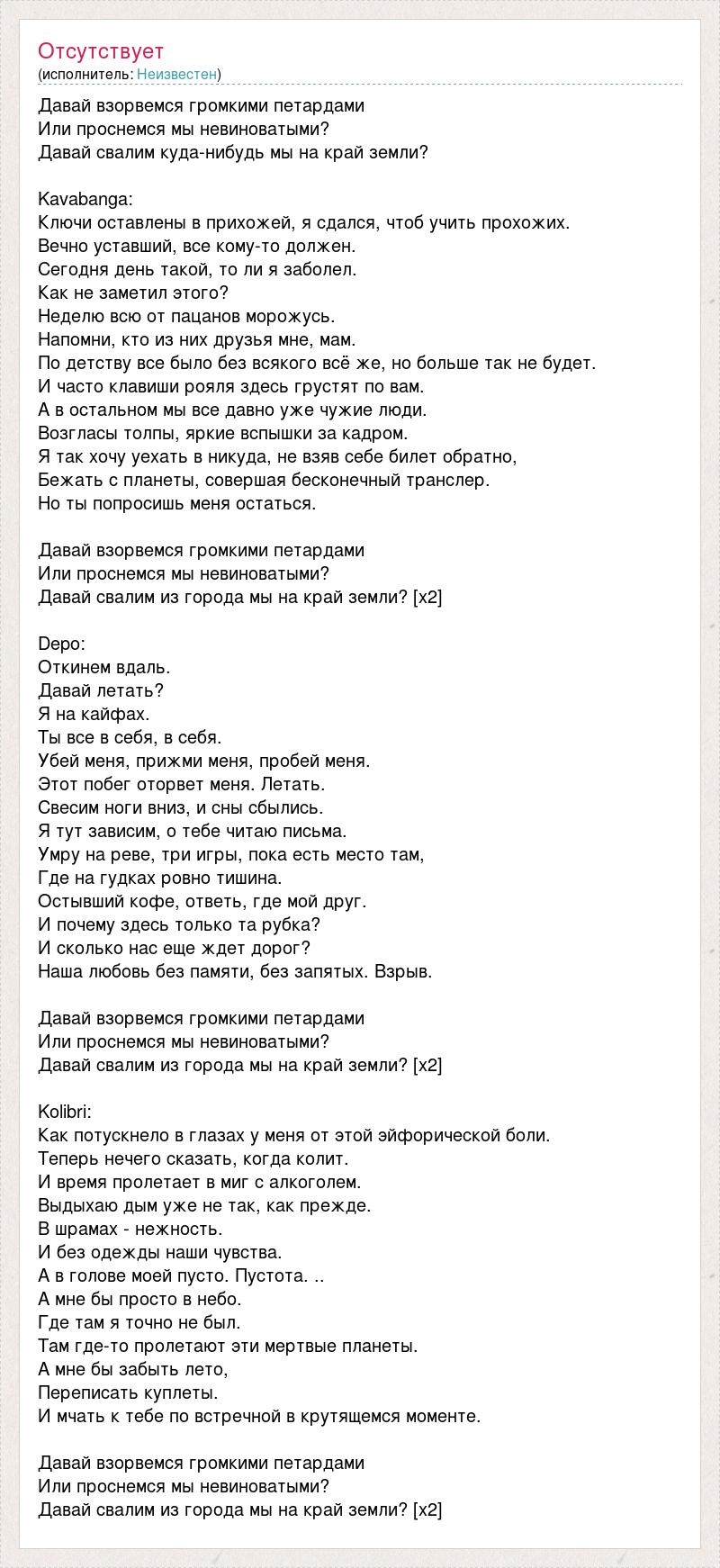 Давай взорвемся громкими петардами Или проснемся мы невиноватыми? Давай свалим куда-нибудь мы на край земли? Kavabanga: Ключи оставлены в прихожей, я сдался, чтоб учить прохожих. Вечно уставший, все кому-то должен. Сегодня день такой, то ли я заболел. Как не заметил этого? Неделю всю от пацанов морожусь. Напомни, кто из них друзья мне, мам. По детству все было без всякого всё же, но больше так не будет. И часто клавиши рояля здесь грустят по вам. А в остальном мы все давно уже чужие люди. Возгласы толпы, яркие вспышки за кадром. Я так хочу уехать в никуда, не взяв себе билет обратно, Бежать с планеты, совершая бесконечный транслер. Но ты попросишь меня остаться. Давай взорвемся громкими петардами Или проснемся мы невиноватыми? Давай свалим из города мы на край земли? [x2] Depo: Откинем вдаль. Давай летать? Я на кайфах. Ты все в себя, в себя. Убей меня, прижми меня, пробей меня. Этот побег оторвет меня. Летать. Свесим ноги вниз, и сны сбылись. Я тут зависим, о тебе читаю письма. Умру на реве, три игры, пока есть место там, Где на гудках ровно тишина. Остывший кофе, ответь, где мой друг. И почему здесь только та рубка? И сколько нас еще ждет дорог? Наша любовь без памяти, без запятых. Взрыв. Давай взорвемся громкими петардами Или проснемся мы невиноватыми? Давай свалим из города мы на край земли? [x2] Kolibri: Как потускнело в глазах у меня от этой эйфорической боли. Теперь нечего сказать, когда колит. И время пролетает в миг с алкоголем. Выдыхаю дым уже не так, как прежде. В шрамах - нежность. И без одежды наши чувства. А в голове моей пусто. Пустота. .. А мне бы просто в небо. Где там я точно не был. Там где-то пролетают эти мертвые планеты. А мне бы забыть лето, Переписать куплеты. И мчать к тебе по встречной в крутящемся моменте. Давай взорвемся громкими петардами Или проснемся мы невиноватыми? Давай свалим из города мы на край земли? [x2]