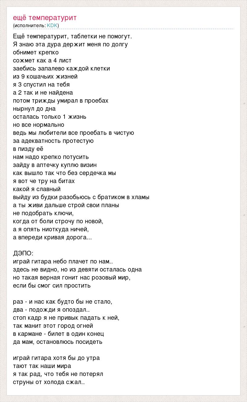 Ещё температурит, таблетки не помогут. Я знаю эта дура держит меня по долгу обнимет крепко сожмет как а 4 лист заебись запалево каждой клетки из 9 кошачьих жизней я 3 спустил на тебя а 2 так и не найдена потом трижды умирал в проебах нырнул до дна осталась только 1 жизнь но все нормально ведь мы любители все проебать в чистую за адекватность протестую в пизду её нам надо крепко потусить зайду в аптечку куплю визин как вышло так что без сердечка мы я вот че тру на битах какой я славный выйду из будки разобьюсь с братиком в хламы а ты живи дальше строй свои планы не подобрать ключи, когда от боли строчу по новой, а я опять ниоткуда ничей, а впереди кривая дорога... ДЭПО: играй гитара небо плачет по нам.. здесь не видно, но из девяти осталась одна но такая верная гонит нас розовый мир, если бы смог сил простить раз - и нас как будто бы не стало, два - подожди я опоздал.. стоп кадр я не привык падать к ней, так манит этот город огней в кармане - билет в один конец да мам, остановлюсь посидеть играй гитара хотя бы до утра тают так наши мира я так рад, что тебя не потерял струны от холода сжал..