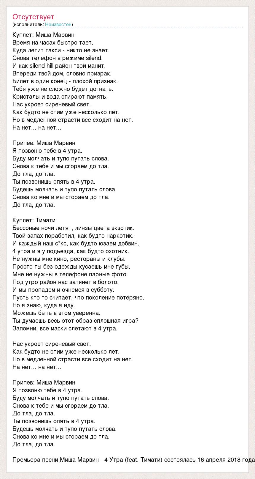 Куплет: Миша Марвин Время на часах быстро тает. Куда летит такси - никто не знает. Снова телефон в режиме silend. И как silend hill район твой манит. Впереди твой дом, словно призрак. Билет в один конец - плохой признак. Тебя уже не сложно будет догнать. Кристалы и вода стирают память. Нас укроет сиреневый свет. Как будто не спим уже несколько лет. Но в медленной страсти все сходит на нет. На нет... на нет... Припев: Миша Марвин Я позвоню тебе в 4 утра. Буду молчать и тупо путать слова. Снова к тебе и мы сгораем до тла. До тла, до тла. Ты позвонишь опять в 4 утра. Будешь молчать и тупо путать слова. Снова ко мне и мы сгораем до тла. До тла, до тла. Куплет: Тимати Бессоные ночи летят, линзы цвета экзотик. Твой запах поработил, как будто наркотик. И каждый наш с*кс, как будто юзаем добвин. 4 утра и я у подьезда, как будто охотник. Не нужны мне кино, рестораны и клубы. Просто ты без одежды кусаешь мне губы. Мне не нужны в телефоне парные фото. Под утро район нас затянет в болото. И мы пропадем и очнемся в субботу. Пусть кто то считает, что поколение потеряно. Но я знаю, куда я иду. Можешь быть в этом уверенна. Ты думаешь весь этот образ сплошная игра? Запомни, все маски слетают в 4 утра. Нас укроет сиреневый свет. Как будто не спим уже несколько лет. Но в медленной страсти все сходит на нет. На нет... на нет... Припев: Миша Марвин Я позвоню тебе в 4 утра. Буду молчать и тупо путать слова. Снова к тебе и мы сгораем до тла. До тла, до тла. Ты позвонишь опять в 4 утра. Будешь молчать и тупо путать слова. Снова ко мне и мы сгораем до тла. До тла, до тла. Премьера песни Миша Марвин - 4 Утра (feat. Тимати) состоялась 16 апреля 2018 года