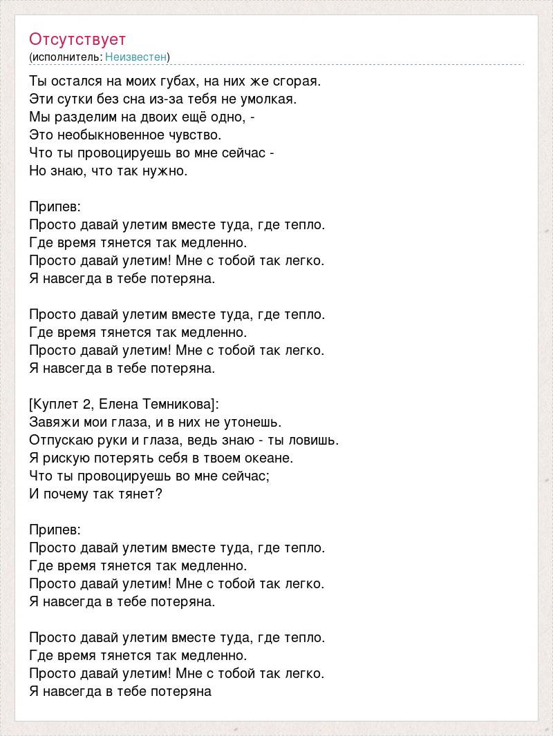 Ты остался на моих губах, на них же сгорая. Эти сутки без сна из-за тебя не умолкая. Мы разделим на двоих ещё одно, - Это необыкновенное чувство. Что ты провоцируешь во мне сейчас - Но знаю, что так нужно. Припев: Просто давай улетим вместе туда, где тепло. Где время тянется так медленно. Просто давай улетим! Мне с тобой так легко. Я навсегда в тебе потеряна. Просто давай улетим вместе туда, где тепло. Где время тянется так медленно. Просто давай улетим! Мне с тобой так легко. Я навсегда в тебе потеряна. [Куплет 2, Елена Темникова]: Завяжи мои глаза, и в них не утонешь. Отпускаю руки и глаза, ведь знаю - ты ловишь. Я рискую потерять себя в твоем океане. Что ты провоцируешь во мне сейчас; И почему так тянет? Припев: Просто давай улетим вместе туда, где тепло. Где время тянется так медленно. Просто давай улетим! Мне с тобой так легко. Я навсегда в тебе потеряна. Просто давай улетим вместе туда, где тепло. Где время тянется так медленно. Просто давай улетим! Мне с тобой так легко. Я навсегда в тебе потеряна