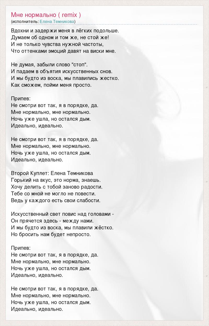 Вдохни и задержи меня в лёгких подольше. Думаем об одном и том же, не стой же! И не только чувства нужной частоты, Что оттенками эмоций давят на виски мне. Не думая, забыли слово "стоп". И падаем в объятия искусственных снов. И мы будто из воска, мы плавились жестко. Как сможем, пойми меня просто. Припев: Не смотри вот так, я в порядке, да. Мне нормально, мне нормально. Ночь уже ушла, но остался дым. Идеально, идеально. Не смотри вот так, я в порядке, да. Мне нормально, мне нормально. Ночь уже ушла, но остался дым. Идеально, идеально. Второй Куплет: Елена Темникова Горький на вкус, это норма, знаешь. Хочу делить с тобой заново радости. Тебе со мной не могло не повести. Ведь у каждого есть свои слабости. Искусственный свет повис над головами - Он прячется здесь - между нами. И мы будто из воска, мы плавили жёстко. Но бросить нам будет непросто. Припев: Не смотри вот так, я в порядке, да. Мне нормально, мне нормально. Ночь уже ушла, но остался дым. Идеально, идеально. Не смотри вот так, я в порядке, да. Мне нормально, мне нормально. Ночь уже ушла, но остался дым. Идеально, идеально.