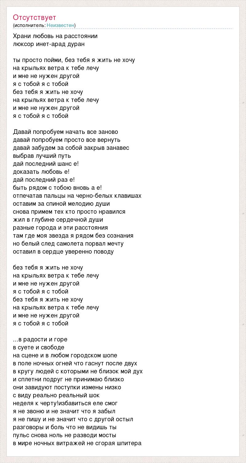 Храни любовь на расстоянии люксор инет-арад дуран ты просто пойми, без тебя я жить не хочу на крыльях ветра к тебе лечу и мне не нужен другой я с тобой я с тобой без тебя я жить не хочу на крыльях ветра к тебе лечу и мне не нужен другой я с тобой я с тобой Давай попробуем начать все заново давай попробуем просто все вернуть давай забудем за собой закрыв занавес выбрав лучший путь дай последний шанс е! доказать любовь е! дай последний раз е! быть рядом с тобою вновь а е! отпечатав пальцы на черно-белых клавишах оставим за спиной мелодию души снова примем тех кто просто нравился жил в глубине сердечной души разные города и эти расстояния там где моя звезда я рядом без сознания но белый след самолета порвал мечту оставил в сердце уверенно поводу без тебя я жить не хочу на крыльях ветра к тебе лечу и мне не нужен другой я с тобой я с тобой без тебя я жить не хочу на крыльях ветра к тебе лечу и мне не нужен другой я с тобой я с тобой ...в радости и горе в суете и свободе на сцене и в любом городском шопе в поле ночных огней что гаснут после двух в кругу людей с которыми не близок мой дух и сплетни подруг не принимаю близко они завидуют поступки измены низко с виду реально реальный шок неделя к черту!избавиться еле смог я не звоню и не значит что я забыл я не пишу и не значит что с другой остыл разговоры и боль что не видишь ты пульс снова ноль не разводи мосты в мире ночных витражей не сгорая шпитера