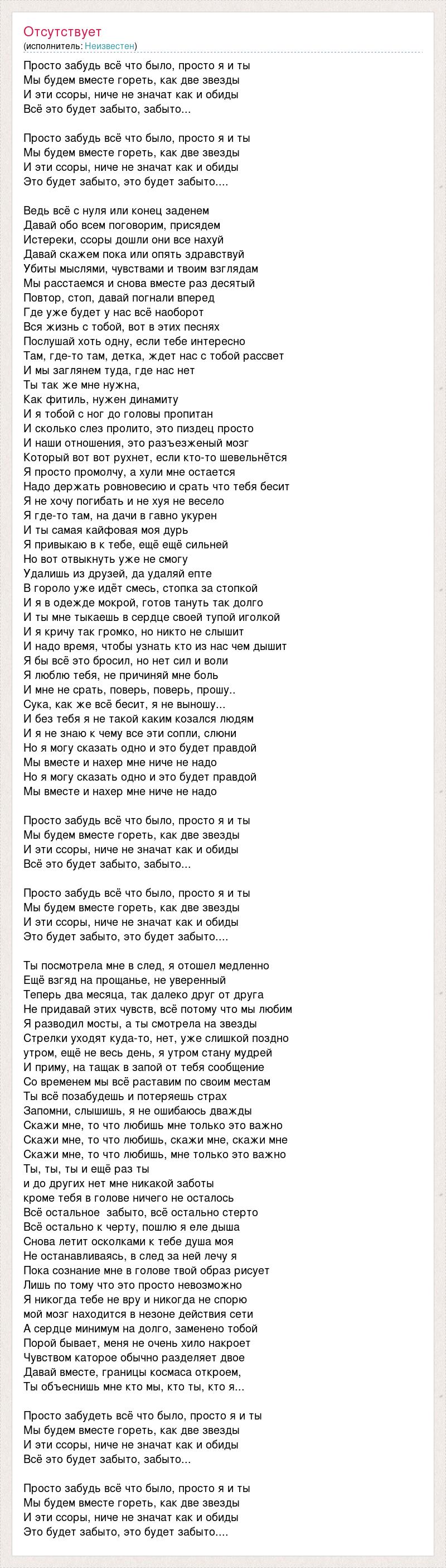 Просто забудь всё что было, просто я и ты Мы будем вместе гореть, как две звезды И эти ссоры, ниче не значат как и обиды Всё это будет забыто, забыто... Просто забудь всё что было, просто я и ты Мы будем вместе гореть, как две звезды И эти ссоры, ниче не значат как и обиды Это будет забыто, это будет забыто.... Ведь всё с нуля или конец заденем Давай обо всем поговорим, присядем Истереки, ссоры дошли они все нахуй Давай скажем пока или опять здравствуй Убиты мыслями, чувствами и твоим взглядам Мы расстаемся и снова вместе раз десятый Повтор, стоп, давай погнали вперед Где уже будет у нас всё наоборот Вся жизнь с тобой, вот в этих песнях Послушай хоть одну, если тебе интересно Там, где-то там, детка, ждет нас с тобой рассвет И мы заглянем туда, где нас нет Ты так же мне нужна, Как фитиль, нужен динамиту И я тобой с ног до головы пропитан И сколько слез пролито, это пиздец просто И наши отношения, это разъезженый мозг Который вот вот рухнет, если кто-то шевельнётся Я просто промолчу, а хули мне остается Надо держать ровновесию и срать что тебя бесит Я не хочу погибать и не хуя не весело Я где-то там, на дачи в гавно укурен И ты самая кайфовая моя дурь Я привыкаю в к тебе, ещё ещё сильней Но вот отвыкнуть уже не смогу Удалишь из друзей, да удаляй епте В гороло уже идёт смесь, стопка за стопкой И я в одежде мокрой, готов тануть так долго И ты мне тыкаешь в сердце своей тупой иголкой И я кричу так громко, но никто не слышит И надо время, чтобы узнать кто из нас чем дышит Я бы всё это бросил, но нет сил и воли Я люблю тебя, не причиняй мне боль И мне не срать, поверь, поверь, прошу.. Сука, как же всё бесит, я не выношу... И без тебя я не такой каким козался людям И я не знаю к чему все эти сопли, слюни Но я могу сказать одно и это будет правдой Мы вместе и нахер мне ниче не надо Но я могу сказать одно и это будет правдой Мы вместе и нахер мне ниче не надо Просто забудь всё что было, просто я и ты Мы будем вместе гореть, как две звезды И эти ссоры, ниче не значат как и обиды Всё это будет забыто, забыто... Просто забудь всё что было, просто я и ты Мы будем вместе гореть, как две звезды И эти ссоры, ниче не значат как и обиды Это будет забыто, это будет забыто.... Ты посмотрела мне в след, я отошел медленно Ещё взгяд на прощанье, не уверенный Теперь два месяца, так далеко друг от друга Не придавай этих чувств, всё потому что мы любим Я разводил мосты, а ты смотрела на звезды Стрелки уходят куда-то, нет, уже слишкой поздно утром, ещё не весь день, я утром стану мудрей И приму, на тащак в запой от тебя сообщение Со временем мы всё раставим по своим местам Ты всё позабудешь и потеряешь страх Запомни, слышишь, я не ошибаюсь дважды Скажи мне, то что любишь мне только это важно Скажи мне, то что любишь, скажи мне, скажи мне Скажи мне, то что любишь, мне только это важно Ты, ты, ты и ещё раз ты и до других нет мне никакой заботы кроме тебя в голове ничего не осталось Всё остальное забыто, всё остально стерто Всё остально к черту, пошлю я еле дыша Снова летит осколками к тебе душа моя Не останавливаясь, в след за ней лечу я Пока сознание мне в голове твой образ рисует Лишь по тому что это просто невозможно Я никогда тебе не вру и никогда не спорю мой мозг находится в незоне действия сети А сердце минимум на долго, заменено тобой Порой бывает, меня не очень хило накроет Чувством каторое обычно разделяет двое Давай вместе, г