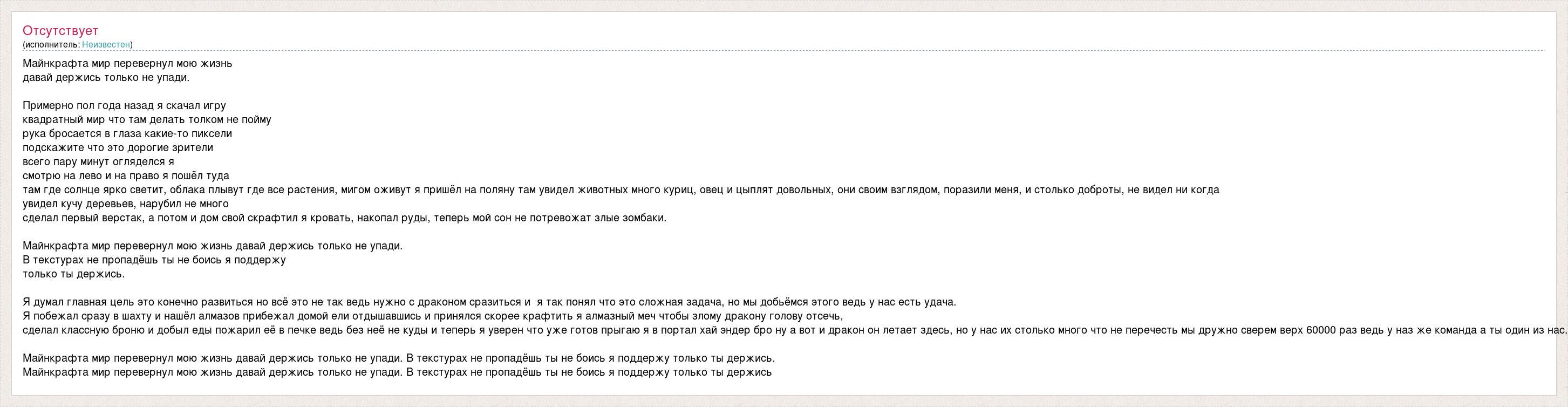 Майнкрафта мир перевернул мою жизнь давай держись только не упади. Примерно пол года назад я скачал игру квадратный мир что там делать толком не пойму рука бросается в глаза какие-то пиксели подскажите что это дорогие зрители всего пару минут огляделся я смотрю на лево и на право я пошёл туда там где солнце ярко светит, облака плывут где все растения, мигом оживут я пришёл на поляну там увидел животных много куриц, овец и цыплят довольных, они своим взглядом, поразили меня, и столько доброты, не видел ни когда увидел кучу деревьев, нарубил не много сделал первый верстак, а потом и дом свой скрафтил я кровать, накопал руды, теперь мой сон не потревожат злые зомбаки. Майнкрафта мир перевернул мою жизнь давай держись только не упади. В текстурах не пропадёшь ты не боись я поддержу только ты держись. Я думал главная цель это конечно развиться но всё это не так ведь нужно с драконом сразиться и я так понял что это сложная задача, но мы добьёмся этого ведь у нас есть удача. Я побежал сразу в шахту и нашёл алмазов прибежал домой ели отдышавшись и принялся скорее крафтить я алмазный меч чтобы злому дракону голову отсечь, сделал классную броню и добыл еды пожарил её в печке ведь без неё не куды и теперь я уверен что уже готов прыгаю я в портал хай эндер бро ну а вот и дракон он летает здесь, но у нас их столько много что не перечесть мы дружно сверем верх 60000 раз ведь у наз же команда а ты один из нас. Майнкрафта мир перевернул мою жизнь давай держись только не упади. В текстурах не пропадёшь ты не боись я поддержу только ты держись. Майнкрафта мир перевернул мою жизнь давай держись только не упади. В текстурах не пропадёшь ты не боись я поддержу только ты держись