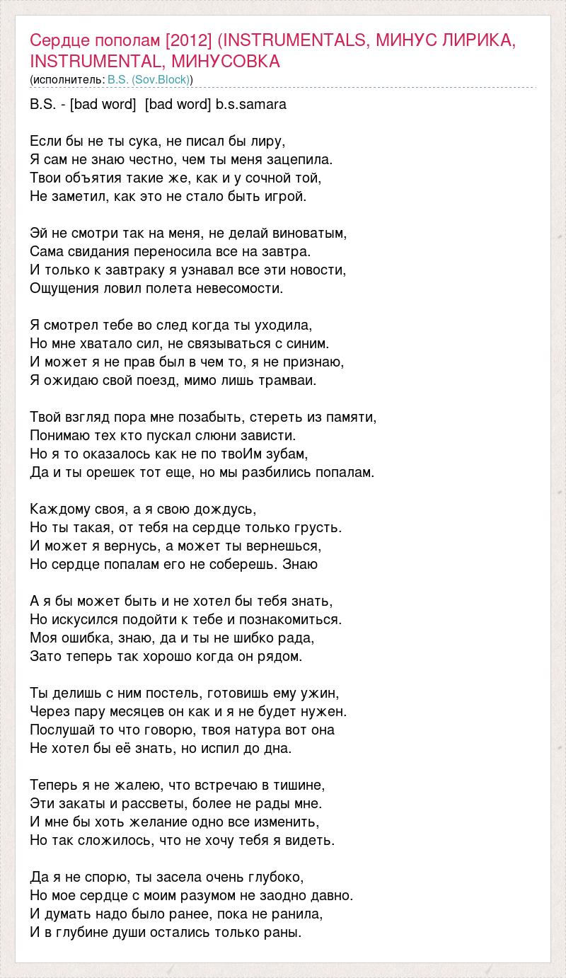 B.S. - [bad word] [bad word] b.s.samara Если бы не ты сука, не писал бы лиру, Я сам не знаю честно, чем ты меня зацепила. Твои объятия такие же, как и у сочной той, Не заметил, как это не стало быть игрой. Эй не смотри так на меня, не делай виноватым, Сама свидания переносила все на завтра. И только к завтраку я узнавал все эти новости, Ощущения ловил полета невесомости. Я смотрел тебе во след когда ты уходила, Но мне хватало сил, не связываться с синим. И может я не прав был в чем то, я не признаю, Я ожидаю свой поезд, мимо лишь трамваи. Твой взгляд пора мне позабыть, стереть из памяти, Понимаю тех кто пускал слюни зависти. Но я то оказалось как не по твоИм зубам, Да и ты орешек тот еще, но мы разбились попалам. Каждому своя, а я свою дождусь, Но ты такая, от тебя на сердце только грусть. И может я вернусь, а может ты вернешься, Но сердце попалам его не соберешь. Знаю А я бы может быть и не хотел бы тебя знать, Но искусился подойти к тебе и познакомиться. Моя ошибка, знаю, да и ты не шибко рада, Зато теперь так хорошо когда он рядом. Ты делишь с ним постель, готовишь ему ужин, Через пару месяцев он как и я не будет нужен. Послушай то что говорю, твоя натура вот она Не хотел бы её знать, но испил до дна. Теперь я не жалею, что встречаю в тишине, Эти закаты и рассветы, более не рады мне. И мне бы хоть желание одно все изменить, Но так сложилось, что не хочу тебя я видеть. Да я не спорю, ты засела очень глубоко, Но мое сердце с моим разумом не заодно давно. И думать надо было ранее, пока не ранила, И в глубине души остались только раны.