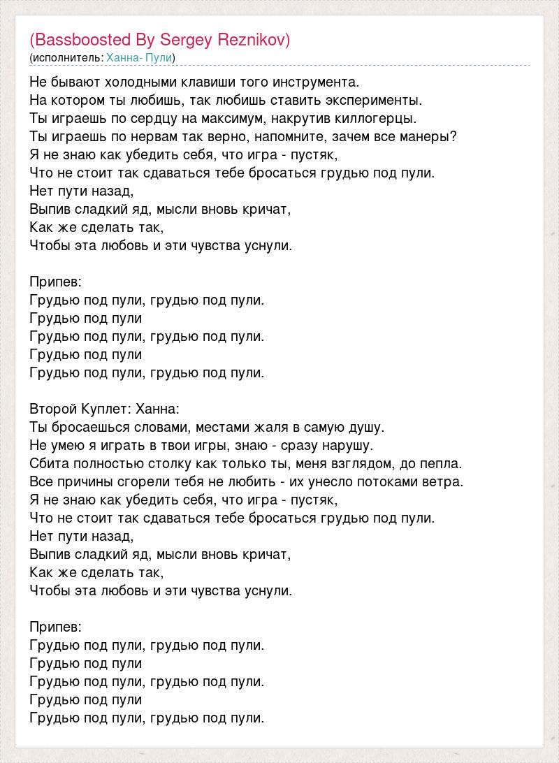 Не бывают холодными клавиши того инструмента. На котором ты любишь, так любишь ставить эксперименты. Ты играешь по сердцу на максимум, накрутив киллогерцы. Ты играешь по нервам так верно, напомните, зачем все манеры? Я не знаю как убедить себя, что игра - пустяк, Что не стоит так сдаваться тебе бросаться грудью под пули. Нет пути назад, Выпив сладкий яд, мысли вновь кричат, Как же сделать так, Чтобы эта любовь и эти чувства уснули. Припев: Грудью под пули, грудью под пули. Грудью под пули Грудью под пули, грудью под пули. Грудью под пули Грудью под пули, грудью под пули. Второй Куплет: Ханна: Ты бросаешься словами, местами жаля в самую душу. Не умею я играть в твои игры, знаю - сразу нарушу. Сбита полностью столку как только ты, меня взглядом, до пепла. Все причины сгорели тебя не любить - их унесло потоками ветра. Я не знаю как убедить себя, что игра - пустяк, Что не стоит так сдаваться тебе бросаться грудью под пули. Нет пути назад, Выпив сладкий яд, мысли вновь кричат, Как же сделать так, Чтобы эта любовь и эти чувства уснули. Припев: Грудью под пули, грудью под пули. Грудью под пули Грудью под пули, грудью под пули. Грудью под пули Грудью под пули, грудью под пули.