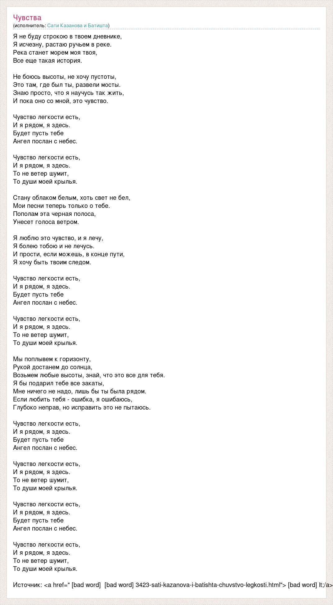 Я не буду строкою в твоем дневнике, Я исчезну, растаю ручьем в реке. Река станет морем моя твоя, Все еще такая история. Не боюсь высоты, не хочу пустоты, Это там, где был ты, развели мосты. Знаю просто, что я научусь так жить, И пока оно со мной, это чувство. Чувство легкости есть, И я рядом, я здесь. Будет пусть тебе Ангел послан с небес. Чувство легкости есть, И я рядом, я здесь. То не ветер шумит, То души моей крылья. Стану облаком белым, хоть свет не бел, Мои песни теперь только о тебе. Пополам эта черная полоса, Унесет голоса ветром. Я люблю это чувство, и я лечу, Я болею тобою и не лечусь. И прости, если можешь, в конце пути, Я хочу быть твоим следом. Чувство легкости есть, И я рядом, я здесь. Будет пусть тебе Ангел послан с небес. Чувство легкости есть, И я рядом, я здесь. То не ветер шумит, То души моей крылья. Мы поплывем к горизонту, Рукой достанем до солнца, Возьмем любые высоты, знай, что это все для тебя. Я бы подарил тебе все закаты, Мне ничего не надо, лишь бы ты была рядом. Если любить тебя - ошибка, я ошибаюсь, Глубоко неправ, но исправить это не пытаюсь. Чувство легкости есть, И я рядом, я здесь. Будет пусть тебе Ангел послан с небес. Чувство легкости есть, И я рядом, я здесь. То не ветер шумит, То души моей крылья. Чувство легкости есть, И я рядом, я здесь. Будет пусть тебе Ангел послан с небес. Чувство легкости есть, И я рядом, я здесь. То не ветер шумит, То души моей крылья. Источник: <a href=" [bad word] [bad word] 3423-sati-kazanova-i-batishta-chuvstvo-legkosti.html"> [bad word] lt;/a>