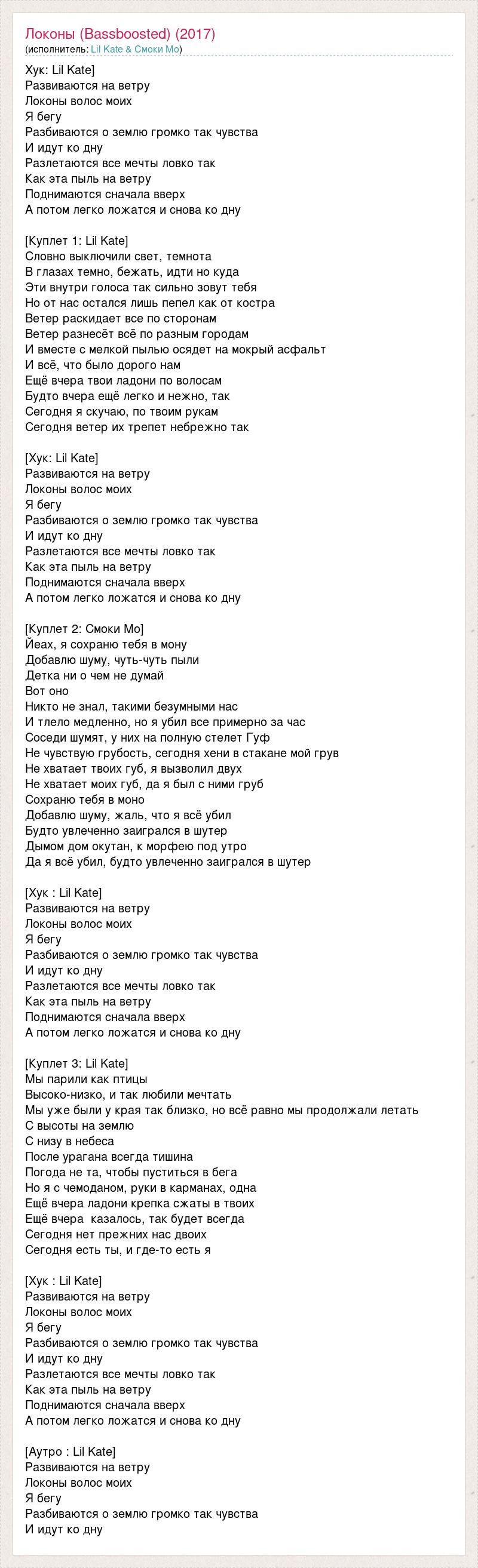 Хук: Lil Kate] Развиваются на ветру Локоны волос моих Я бегу Разбиваются о землю громко так чувства И идут ко дну Разлетаются все мечты ловко так Как эта пыль на ветру Поднимаются сначала вверх А потом легко ложатся и снова ко дну [Куплет 1: Lil Kate] Словно выключили свет, темнота В глазах темно, бежать, идти но куда Эти внутри голоса так сильно зовут тебя Но от нас остался лишь пепел как от костра Ветер раскидает все по сторонам Ветер разнесёт всё по разным городам И вместе с мелкой пылью осядет на мокрый асфальт И всё, что было дорого нам Ещё вчера твои ладони по волосам Будто вчера ещё легко и нежно, так Сегодня я скучаю, по твоим рукам Сегодня ветер их трепет небрежно так [Хук: Lil Kate] Развиваются на ветру Локоны волос моих Я бегу Разбиваются о землю громко так чувства И идут ко дну Разлетаются все мечты ловко так Как эта пыль на ветру Поднимаются сначала вверх А потом легко ложатся и снова ко дну [Куплет 2: Смоки Мо] Йеах, я сохраню тебя в мону Добавлю шуму, чуть-чуть пыли Детка ни о чем не думай Вот оно Никто не знал, такими безумными нас И тлело медленно, но я убил все примерно за час Соседи шумят, у них на полную стелет Гуф Не чувствую грубость, сегодня хени в стакане мой грув Не хватает твоих губ, я вызволил двух Не хватает моих губ, да я был с ними груб Сохраню тебя в моно Добавлю шуму, жаль, что я всё убил Будто увлеченно заигрался в шутер Дымом дом окутан, к морфею под утро Да я всё убил, будто увлеченно заигрался в шутер [Хук : Lil Kate] Развиваются на ветру Локоны волос моих Я бегу Разбиваются о землю громко так чувства И идут ко дну Разлетаются все мечты ловко так Как эта пыль на ветру Поднимаются сначала вверх А потом легко ложатся и снова ко дну [Куплет 3: Lil Kate] Мы парили как птицы Высоко-низко, и так любили мечтать Мы уже были у края так близко, но всё равно мы продолжали летать С высоты на землю С низу в небеса После урагана всегда тишина Погода не та, чтобы пуститься в бега Но я с чемоданом, руки в карманах, одна Ещё вчера ладони крепка сжаты в твоих Ещё вчера казалось, так будет всегда Сегодня нет прежних нас двоих Сегодня есть ты, и где-то есть я [Хук : Lil Kate] Развиваются на ветру Локоны волос моих Я бегу Разбиваются о землю громко так чувства И идут ко дну Разлетаются все мечты ловко так Как эта пыль на ветру Поднимаются сначала вверх А потом легко ложатся и снова ко дну [Аутро : Lil Kate] Развиваются на ветру Локоны волос моих Я бегу Разбиваются о землю громко так чувства И идут ко дну