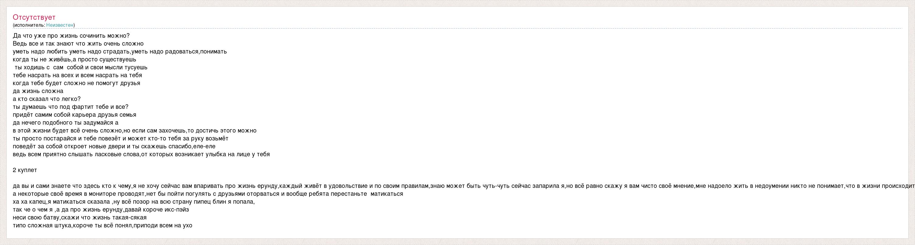 Да что уже про жизнь сочинить можно? Ведь все и так знают что жить очень сложно уметь надо любить уметь надо страдать,уметь надо радоваться,понимать когда ты не живёшь,а просто существуешь ты ходишь с сам собой и свои мысли тусуешь тебе насрать на всех и всем насрать на тебя когда тебе будет сложно не помогут друзья да жизнь сложна а кто сказал что легко? ты думаешь что под фартит тебе и все? придёт самим собой карьера друзья семья да нечего подобного ты задумайся а в этой жизни будет всё очень сложно,но если сам захочешь,то достичь этого можно ты просто постарайся и тебе повезёт и может кто-то тебя за руку возьмёт поведёт за собой откроет новые двери и ты скажешь спасибо,еле-еле ведь всем приятно слышать ласковые слова,от которых возникает улыбка на лице у тебя 2 куплет да вы и сами знаете что здесь кто к чему,я не хочу сейчас вам впаривать про жизнь ерунду,каждый живёт в удовольствие и по своим правилам,знаю может быть чуть-чуть сейчас запарила я,но всё равно скажу я вам чисто своё мнение,мне надоело жить в недоумении никто не понимает,что в жизни происходит а некоторые своё время в мониторе проводят,нет бы пойти погулять с друзьями оторваться и вообще ребята перестаньте матикаться ха ха капец,я матикаться сказала ,ну всё позор на всю страну пипец блин я попала, так че о чем я ,а да про жизнь ерунду,давай короче икс-пэйз неси свою батву,скажи что жизнь такая-сякая типо сложная штука,короче ты всё понял,приподи всем на ухо
