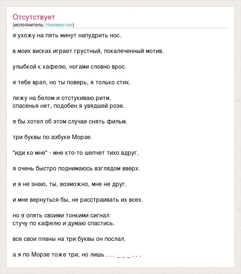 я ухожу на пять минут напудрить нос. в моих висках играет грустный, покалеченный мотив. улыбкой к кафелю, ногами словно врос. я тебе врал, но ты поверь, я только стих. лежу на белом и отстукиваю ритм. спасенья нет, подобен я увядшей розе. я бы хотел об этом случае снять фильм. три буквы по азбуке Морзе. "иди ко мне" - мне кто-то шепчет тихо вдруг. я очень быстро поднимаюсь взглядом вверх. и я не знаю, ты, возможно, мне не друг. и мне вернуться бы, не расстраивать их всех. но я опять своими тонкими сигнал стучу по кафелю и думаю спастись. все свои планы на три буквы он послал. а я по Морзе тоже три, но лишь . . . _ _ _ . . .