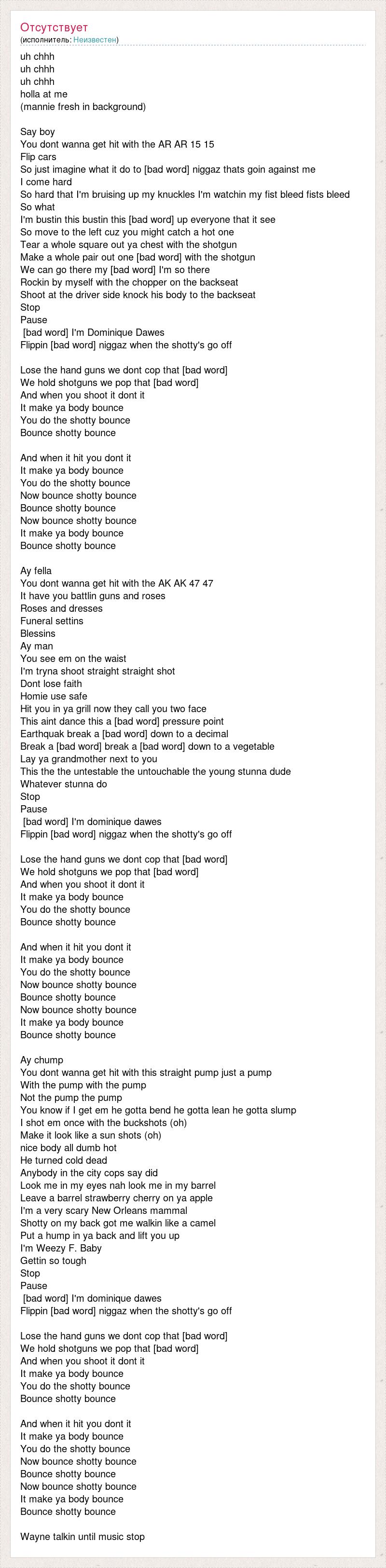 uh chhh uh chhh uh chhh holla at me (mannie fresh in background) Say boy You dont wanna get hit with the AR AR 15 15 Flip cars So just imagine what it do to [bad word] niggaz thats goin against me I come hard So hard that I'm bruising up my knuckles I'm watchin my fist bleed fists bleed So what I'm bustin this bustin this [bad word] up everyone that it see So move to the left cuz you might catch a hot one Tear a whole square out ya chest with the shotgun Make a whole pair out one [bad word] with the shotgun We can go there my [bad word] I'm so there Rockin by myself with the chopper on the backseat Shoot at the driver side knock his body to the backseat Stop Pause [bad word] I'm Dominique Dawes Flippin [bad word] niggaz when the shotty's go off Lose the hand guns we dont cop that [bad word] We hold shotguns we pop that [bad word] And when you shoot it dont it It make ya body bounce You do the shotty bounce Bounce shotty bounce And when it hit you dont it It make ya body bounce You do the shotty bounce Now bounce shotty bounce Bounce shotty bounce Now bounce shotty bounce It make ya body bounce Bounce shotty bounce Ay fella You dont wanna get hit with the AK AK 47 47 It have you battlin guns and roses Roses and dresses Funeral settins Blessins Ay man You see em on the waist I'm tryna shoot straight straight shot Dont lose faith Homie use safe Hit you in ya grill now they call you two face This aint dance this a [bad word] pressure point Earthquak break a [bad word] down to a decimal Break a [bad word] break a [bad word] down to a vegetable Lay ya grandmother next to you This the the untestable the untouchable the young stunna dude Whatever stunna do Stop Pause [bad word] I'm dominique dawes Flippin [bad word] niggaz when the shotty's go off Lose the hand guns we dont cop that [bad word] We hold shotguns we pop that [bad word] And when you shoot it dont it It make ya body bounce You do the shotty bounce Bounce shotty bounce And when it hit you dont it It make ya body bounce You do the shotty bounce Now bounce shotty bounce Bounce shotty bounce Now bounce shotty bounce It make ya body bounce Bounce shotty bounce Ay chump You dont wanna get hit with this straight pump just a pump With the pump with the pump Not the pump the pump You know if I get em he gotta bend he gotta lean he gotta slump I shot em once with the buckshots (oh) Make it look like a sun shots (oh) nice body all dumb hot He turned cold dead Anybody in the city cops say did Look me in my eyes nah look me in my barrel Leave a barrel strawberry cherry on ya apple I'm a very scary New Orleans mammal Shotty on my back got me walkin like a camel Put a hump in ya back and lift you up I'm Weezy F. Baby Gettin so tough Stop Pause [bad word] I'm dominique dawes Flippin [bad word] niggaz when the shotty's go off Lose the hand guns we dont cop that [bad word] We hold shotguns we pop that [bad word] And when you shoot it dont it It make ya body bounce You do the shotty bounce Bounce shotty bounce And when it hit you dont it It make ya body bounce You do the shotty bounce Now bounce shotty bounce Bounce shotty bounce Now bounce shotty bounce It make ya body bounce Bounce shotty bounce Wayne talkin until music stop