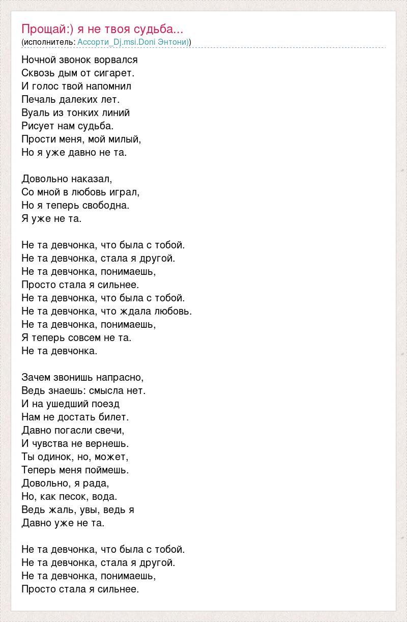 Ночной звонок ворвался Сквозь дым от сигарет. И голос твой напомнил Печаль далеких лет. Вуаль из тонких линий Рисует нам судьба. Прости меня, мой милый, Но я уже давно не та. Довольно наказал, Со мной в любовь играл, Но я теперь свободна. Я уже не та. Не та девчонка, что была с тобой. Не та девчонка, стала я другой. Не та девчонка, понимаешь, Просто стала я сильнее. Не та девчонка, что была с тобой. Не та девчонка, что ждала любовь. Не та девчонка, понимаешь, Я теперь совсем не та. Не та девчонка. Зачем звонишь напрасно, Ведь знаешь: смысла нет. И на ушедший поезд Нам не достать билет. Давно погасли свечи, И чувства не вернешь. Ты одинок, но, может, Теперь меня поймешь. Довольно, я рада, Но, как песок, вода. Ведь жаль, увы, ведь я Давно уже не та. Не та девчонка, что была с тобой. Не та девчонка, стала я другой. Не та девчонка, понимаешь, Просто стала я сильнее.