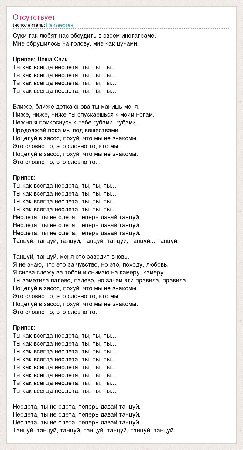 Cуки так любят нас обсудить в своем инстаграме. Мне обрушилось на голову, мне как цунами. Припев: Леша Свик Ты как всегда неодета, ты, ты, ты... Ты как всегда неодета, ты, ты, ты... Ты как всегда неодета, ты, ты, ты... Ты как всегда неодета, ты, ты, ты... Ближе, ближе детка снова ты манишь меня. Ниже, ниже, ниже ты спускаешься к моим ногам. Нежно я прикоснусь к тебе губами, губами. Продолжай пока мы под веществами. Поцелуй в засос, похуй, что мы не знакомы. Это словно то, это словно то, кто мы. Поцелуй в засос, похуй, что мы не знакомы. Это словно то, это словно то... Припев: Ты как всегда неодета, ты, ты, ты... Ты как всегда неодета, ты, ты, ты... Ты как всегда неодета, ты, ты, ты... Ты как всегда неодета, ты, ты, ты... Неодета, ты не одета, теперь давай танцуй. Неодета, ты не одета, теперь давай танцуй. Неодета, ты не одета, теперь давай танцуй. Танцуй, танцуй, танцуй, танцуй, танцуй, танцуй... танцуй. Танцуй, танцуй, меня это заводит вновь. Я не знаю, что это за чувство, но это, походу, любовь. Я снова слежу за тобой и снимаю на камеру, камеру. Ты заметила палево, палево, но зачем эти правила, правила. Поцелуй в засос, похуй, что мы не знакомы. Это словно то, это словно то, кто мы. Поцелуй в засос, похуй, что мы не знакомы. Это словно то, это словно то. Припев: Ты как всегда неодета, ты, ты, ты... Ты как всегда неодета, ты, ты, ты... Ты как всегда неодета, ты, ты, ты... Ты как всегда неодета, ты, ты, ты... Ты как всегда неодета, ты, ты, ты... Ты как всегда неодета, ты, ты, ты... Ты как всегда неодета, ты, ты, ты... Ты как всегда неодета, ты, ты, ты... Неодета, ты не одета, теперь давай танцуй. Неодета, ты не одета, теперь давай танцуй. Неодета, ты не одета, теперь давай танцуй. Танцуй, танцуй, танцуй, танцуй, танцуй, танцуй, танцуй.