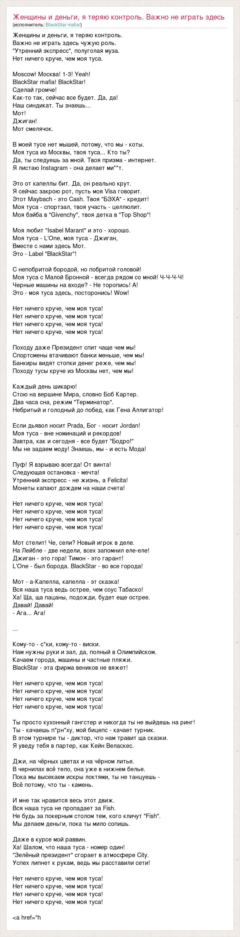 Женщины и деньги, я теряю контроль. Важно не играть здесь чужую роль. "Утренний экспресс", полуголая муза. Нет ничего круче, чем моя туса. Moscow! Москва! 1-3! Yeah! BlackStar mafia! BlackStar! Сделай громче! Как-то так, сейчас все будет. Да, да! Наш синдикат. Ты знаешь... Мот! Джиган! Мот смелячок. В моей тусе нет мышей, потому, что мы - коты. Моя туса из Москвы, твоя туса... Кто ты? Да, ты следуешь за мной. Твоя призма - интернет. Я листаю Instagram - она делает ми**т. Это от капеллы бит. Да, он реально крут. Я сейчас закрою рот, пусть моя Visa говорит. Этот Maybach - это Cash. Твоя "БЭХА" - кредит! Моя туса - спортзал, твоя участь - целлюлит. Моя бэйба в "Givenchy", твоя детка в "Top Shop"! Моя любит "Isabel Marant" и это - хорошо. Моя туса - L’One, моя туса - Джиган, Вместе с нами здесь Мот. Это - Label "BlackStar"! С непобритой бородой, но побритой головой! Моя туса с Малой Бронной - всегда рядом со мной! Ч-Ч-Ч-Ч! Черные машины на входе? - Не торопись! А! Это - моя туса здесь, посторонись! Wow! Нет ничего круче, чем моя туса! Нет ничего круче, чем моя туса! Нет ничего круче, чем моя туса! Нет ничего круче, чем моя туса! Походу даже Президент спит чаще чем мы! Спортсмены втачивают банки меньше, чем мы! Банкиры видят стопки денег реже, чем мы! Походу тусы круче из Москвы нет, чем мы! Каждый день шикарю! Стою на вершине Мира, словно Боб Картер. Два часа сна, режим "Терминатор". Небритый и голодный до побед, как Гена Аллигатор! Если дьявол носит Prada, Бог - носит Jordan! Моя туса - вне номинаций и рекордов! Завтра, как и сегодня - все будет "Бодро!" Мы не задаем моду! Знаешь, мы - и есть Мода! Пуф! Я взрываю всегда! От винта! Следующая остановка - мечта! Утренний экспресс - не жизнь, а Felicita! Монеты капают дождем на наши счета! Нет ничего круче, чем моя туса! Нет ничего круче, чем моя туса! Нет ничего круче, чем моя туса! Нет ничего круче, чем моя туса! Мот стелит! Че, сели? Новый игрок в деле. На Лейбле - две недели, всех запомнил еле-еле! Джиган - это гора! Тимон - это гарант! L’One - был борода. BlackStar - во все города! Мот - а-Капелла, капелла - эт сказка! Вся наша туса ведь острее, чем соус Табаско! Ха! Ща, ща пацаны, подожди, будет еще острее. Давай! Давай! - Ага... Ага! ... Кому-то - с*ки, кому-то - виски. Нам нужны руки и зал, да, полный в Олимпийском. Качаем города, машины и частные пляжи. BlackStar - эта фирма веников не вяжет! Нет ничего круче, чем моя туса! Нет ничего круче, чем моя туса! Нет ничего круче, чем моя туса! Нет ничего круче, чем моя туса! Ты просто кухонный гангстер и никогда ты не выйдешь на ринг! Ты - качаешь п*рн*ху, мой бицепс - качает турник. В этом турнире ты - диктор, что нам травит ща сказки. Я уведу тебя в партер, как Кейн Веласкес. Джи, на чёрных цветах и на чёрном литье. В чернилах всё тело, она уже в нижнем белье. Пока мы высекаем искры локтями, ты не танцуешь - Всё потому, что ты - камень. И мне так нравится весь этот движ. Вся наша туса не пропадает за Fish. Не будь за покерным столом тем, кого кличут "Fish". Мы делаем деньги, пока ты мило сопишь. Даже в курсе мой раввин. Ха! Шалом, что наша туса - номер один! "Зелёный президент" сгорает в атмосфере City. Успех липнет к рукам, ведь мы расставили сети! Нет ничего круче, чем моя туса! Нет ничего круче, чем моя туса! Нет ничего круче, чем моя туса! Нет ничего круче, чем моя туса! <a href="h