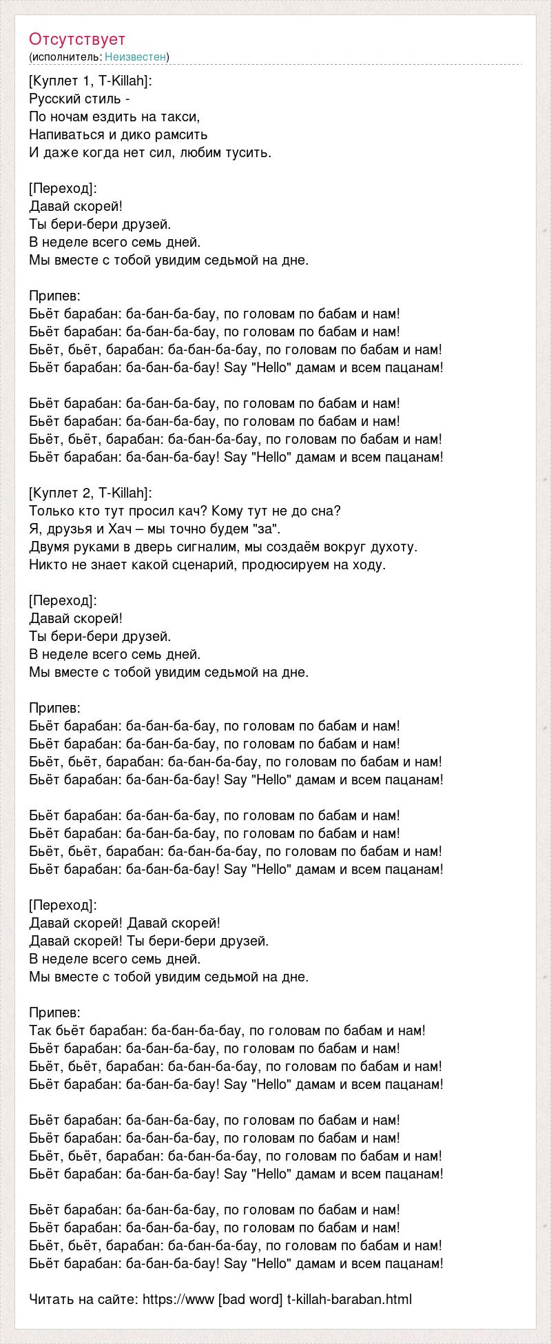[Куплет 1, T-Killah]: Русский стиль - По ночам ездить на такси, Напиваться и дико рамсить И даже когда нет сил, любим тусить. [Переход]: Давай скорей! Ты бери-бери друзей. В неделе всего семь дней. Мы вместе с тобой увидим седьмой на дне. Припев: Бьёт барабан: ба-бан-ба-бау, по головам по бабам и нам! Бьёт барабан: ба-бан-ба-бау, по головам по бабам и нам! Бьёт, бьёт, барабан: ба-бан-ба-бау, по головам по бабам и нам! Бьёт барабан: ба-бан-ба-бау! Say "Hello" дамам и всем пацанам! Бьёт барабан: ба-бан-ба-бау, по головам по бабам и нам! Бьёт барабан: ба-бан-ба-бау, по головам по бабам и нам! Бьёт, бьёт, барабан: ба-бан-ба-бау, по головам по бабам и нам! Бьёт барабан: ба-бан-ба-бау! Say "Hello" дамам и всем пацанам! [Куплет 2, T-Killah]: Только кто тут просил кач? Кому тут не до сна? Я, друзья и Хач – мы точно будем "за". Двумя руками в дверь сигналим, мы создаём вокруг духоту. Никто не знает какой сценарий, продюсируем на ходу. [Переход]: Давай скорей! Ты бери-бери друзей. В неделе всего семь дней. Мы вместе с тобой увидим седьмой на дне. Припев: Бьёт барабан: ба-бан-ба-бау, по головам по бабам и нам! Бьёт барабан: ба-бан-ба-бау, по головам по бабам и нам! Бьёт, бьёт, барабан: ба-бан-ба-бау, по головам по бабам и нам! Бьёт барабан: ба-бан-ба-бау! Say "Hello" дамам и всем пацанам! Бьёт барабан: ба-бан-ба-бау, по головам по бабам и нам! Бьёт барабан: ба-бан-ба-бау, по головам по бабам и нам! Бьёт, бьёт, барабан: ба-бан-ба-бау, по головам по бабам и нам! Бьёт барабан: ба-бан-ба-бау! Say "Hello" дамам и всем пацанам! [Переход]: Давай скорей! Давай скорей! Давай скорей! Ты бери-бери друзей. В неделе всего семь дней. Мы вместе с тобой увидим седьмой на дне. Припев: Так бьёт барабан: ба-бан-ба-бау, по головам по бабам и нам! Бьёт барабан: ба-бан-ба-бау, по головам по бабам и нам! Бьёт, бьёт, барабан: ба-бан-ба-бау, по головам по бабам и нам! Бьёт барабан: ба-бан-ба-бау! Say "Hello" дамам и всем пацанам! Бьёт барабан: ба-бан-ба-бау, по головам по бабам и нам! Бьёт барабан: ба-бан-ба-бау, по головам по бабам и нам! Бьёт, бьёт, барабан: ба-бан-ба-бау, по головам по бабам и нам! Бьёт барабан: ба-бан-ба-бау! Say "Hello" дамам и всем пацанам! Бьёт барабан: ба-бан-ба-бау, по головам по бабам и нам! Бьёт барабан: ба-бан-ба-бау, по головам по бабам и нам! Бьёт, бьёт, барабан: ба-бан-ба-бау, по головам по бабам и нам! Бьёт барабан: ба-бан-ба-бау! Say "Hello" дамам и всем пацанам! Читать на сайте: https://www [bad word] t-killah-baraban.html