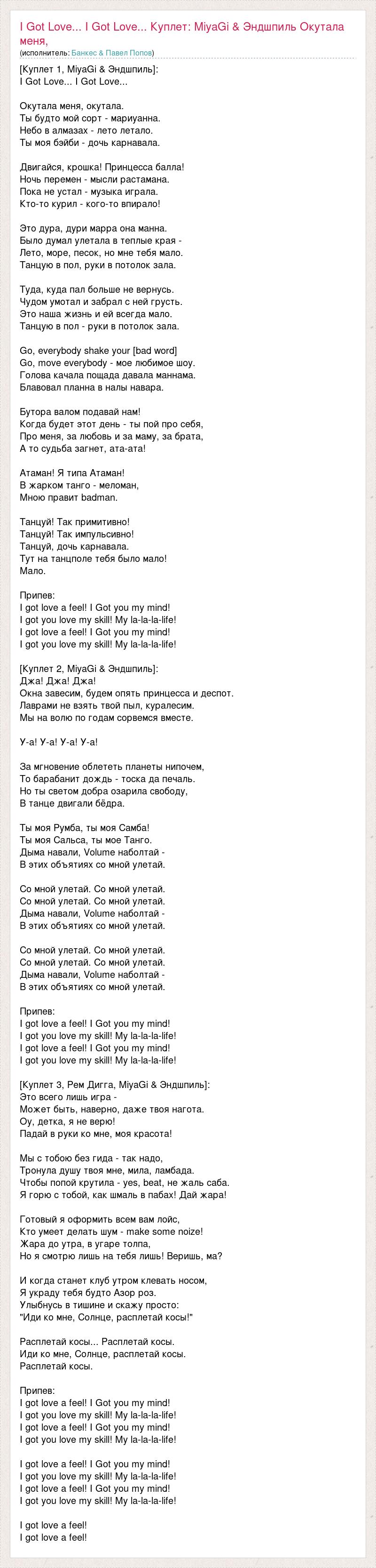 [Куплет 1, MiyaGi & Эндшпиль]: I Got Love... I Got Love... Окутала меня, окутала. Ты будто мой сорт - мариуанна. Небо в алмазах - лето летало. Ты моя бэйби - дочь карнавала. Двигайся, крошка! Принцесса балла! Ночь перемен - мысли растамана. Пока не устал - музыка играла. Кто-то курил - кого-то впирало! Это дура, дури марра она манна. Было думал улетала в теплые края - Лето, море, песок, но мне тебя мало. Танцую в пол, руки в потолок зала. Туда, куда пал больше не вернусь. Чудом умотал и забрал с ней грусть. Это наша жизнь и ей всегда мало. Танцую в пол - руки в потолок зала. Go, everybody shake your [bad word] Go, move everybody - мое любимое шоу. Голова качала пощада давала маннама. Блавовал планна в налы навара. Бутора валом подавай нам! Когда будет этот день - ты пой про себя, Про меня, за любовь и за маму, за брата, А то судьба загнет, ата-ата! Атаман! Я типа Атаман! В жарком танго - меломан, Мною правит badman. Танцуй! Так примитивно! Танцуй! Так импульсивно! Танцуй, дочь карнавала. Тут на танцполе тебя было мало! Мало. Припев: I got love a feel! I Got you my mind! I got you love my skill! My la-la-la-life! I got love a feel! I Got you my mind! I got you love my skill! My la-la-la-life! [Куплет 2, MiyaGi & Эндшпиль]: Джа! Джа! Джа! Окна завесим, будем опять принцесса и деспот. Лаврами не взять твой пыл, куралесим. Мы на волю по годам сорвемся вместе. У-а! У-а! У-а! У-а! За мгновение облететь планеты нипочем, То барабанит дождь - тоска да печаль. Но ты светом добра озарила свободу, В танце двигали бёдра. Ты моя Румба, ты моя Самба! Ты моя Сальса, ты мое Танго. Дыма навали, Volume наболтай - В этих объятиях со мной улетай. Со мной улетай. Со мной улетай. Со мной улетай. Со мной улетай. Дыма навали, Volume наболтай - В этих объятиях со мной улетай. Со мной улетай. Со мной улетай. Со мной улетай. Со мной улетай. Дыма навали, Volume наболтай - В этих объятиях со мной улетай. Припев: I got love a feel! I Got you my mind! I got you love my skill! My la-la-la-life! I got love a feel! I Got you my mind! I got you love my skill! My la-la-la-life! [Куплет 3, Рем Дигга, MiyaGi & Эндшпиль]: Это всего лишь игра - Может быть, наверно, даже твоя нагота. Оу, детка, я не верю! Падай в руки ко мне, моя красота! Мы с тобою без гида - так надо, Тронула душу твоя мне, мила, ламбада. Чтобы попой крутила - yes, beat, не жаль саба. Я горю с тобой, как шмаль в пабах! Дай жара! Готовый я оформить всем вам лойс, Кто умеет делать шум - make some noize! Жара до утра, в угаре толпа, Но я смотрю лишь на тебя лишь! Веришь, ма? И когда станет клуб утром клевать носом, Я украду тебя будто Азор роз. Улыбнусь в тишине и скажу просто: "Иди ко мне, Солнце, расплетай косы!" Расплетай косы... Расплетай косы. Иди ко мне, Солнце, расплетай косы. Расплетай косы. Припев: I got love a feel! I Got you my mind! I got you love my skill! My la-la-la-life! I got love a feel! I Got you my mind! I got you love my skill! My la-la-la-life! I got love a feel! I Got you my mind! I got you love my skill! My la-la-la-life! I got love a feel! I Got you my mind! I got you love my skill! My la-la-la-life! I got love a feel! I got love a feel!