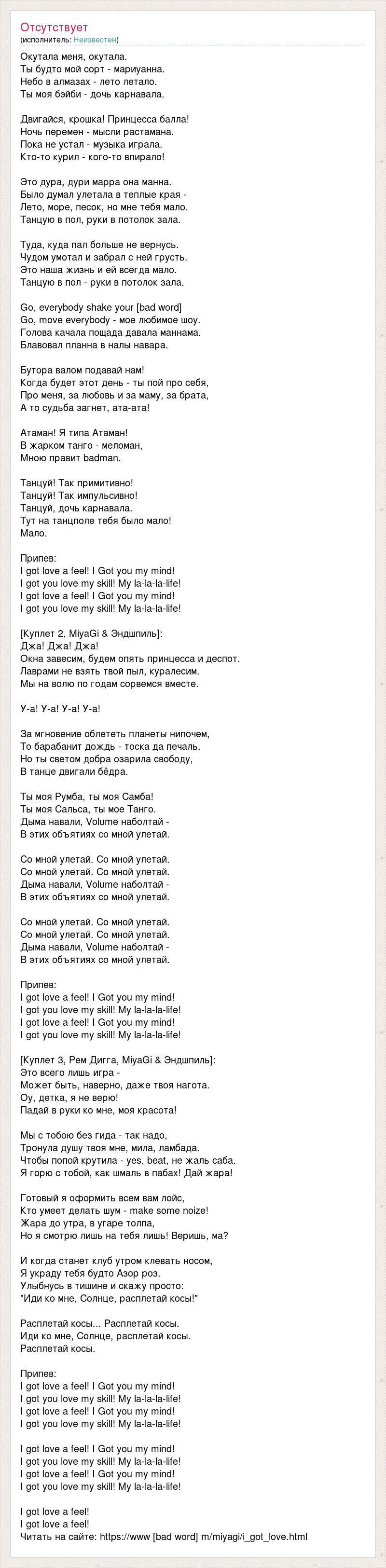 Окутала меня, окутала. Ты будто мой сорт - мариуанна. Небо в алмазах - лето летало. Ты моя бэйби - дочь карнавала. Двигайся, крошка! Принцесса балла! Ночь перемен - мысли растамана. Пока не устал - музыка играла. Кто-то курил - кого-то впирало! Это дура, дури марра она манна. Было думал улетала в теплые края - Лето, море, песок, но мне тебя мало. Танцую в пол, руки в потолок зала. Туда, куда пал больше не вернусь. Чудом умотал и забрал с ней грусть. Это наша жизнь и ей всегда мало. Танцую в пол - руки в потолок зала. Go, everybody shake your [bad word] Go, move everybody - мое любимое шоу. Голова качала пощада давала маннама. Блавовал планна в налы навара. Бутора валом подавай нам! Когда будет этот день - ты пой про себя, Про меня, за любовь и за маму, за брата, А то судьба загнет, ата-ата! Атаман! Я типа Атаман! В жарком танго - меломан, Мною правит badman. Танцуй! Так примитивно! Танцуй! Так импульсивно! Танцуй, дочь карнавала. Тут на танцполе тебя было мало! Мало. Припев: I got love a feel! I Got you my mind! I got you love my skill! My la-la-la-life! I got love a feel! I Got you my mind! I got you love my skill! My la-la-la-life! [Куплет 2, MiyaGi & Эндшпиль]: Джа! Джа! Джа! Окна завесим, будем опять принцесса и деспот. Лаврами не взять твой пыл, куралесим. Мы на волю по годам сорвемся вместе. У-а! У-а! У-а! У-а! За мгновение облететь планеты нипочем, То барабанит дождь - тоска да печаль. Но ты светом добра озарила свободу, В танце двигали бёдра. Ты моя Румба, ты моя Самба! Ты моя Сальса, ты мое Танго. Дыма навали, Volume наболтай - В этих объятиях со мной улетай. Со мной улетай. Со мной улетай. Со мной улетай. Со мной улетай. Дыма навали, Volume наболтай - В этих объятиях со мной улетай. Со мной улетай. Со мной улетай. Со мной улетай. Со мной улетай. Дыма навали, Volume наболтай - В этих объятиях со мной улетай. Припев: I got love a feel! I Got you my mind! I got you love my skill! My la-la-la-life! I got love a feel! I Got you my mind! I got you love my skill! My la-la-la-life! [Куплет 3, Рем Дигга, MiyaGi & Эндшпиль]: Это всего лишь игра - Может быть, наверно, даже твоя нагота. Оу, детка, я не верю! Падай в руки ко мне, моя красота! Мы с тобою без гида - так надо, Тронула душу твоя мне, мила, ламбада. Чтобы попой крутила - yes, beat, не жаль саба. Я горю с тобой, как шмаль в пабах! Дай жара! Готовый я оформить всем вам лойс, Кто умеет делать шум - make some noize! Жара до утра, в угаре толпа, Но я смотрю лишь на тебя лишь! Веришь, ма? И когда станет клуб утром клевать носом, Я украду тебя будто Азор роз. Улыбнусь в тишине и скажу просто: "Иди ко мне, Солнце, расплетай косы!" Расплетай косы... Расплетай косы. Иди ко мне, Солнце, расплетай косы. Расплетай косы. Припев: I got love a feel! I Got you my mind! I got you love my skill! My la-la-la-life! I got love a feel! I Got you my mind! I got you love my skill! My la-la-la-life! I got love a feel! I Got you my mind! I got you love my skill! My la-la-la-life! I got love a feel! I Got you my mind! I got you love my skill! My la-la-la-life! I got love a feel! I got love a feel! Читать на сайте: https://www [bad word] m/miyagi/i_got_love.html
