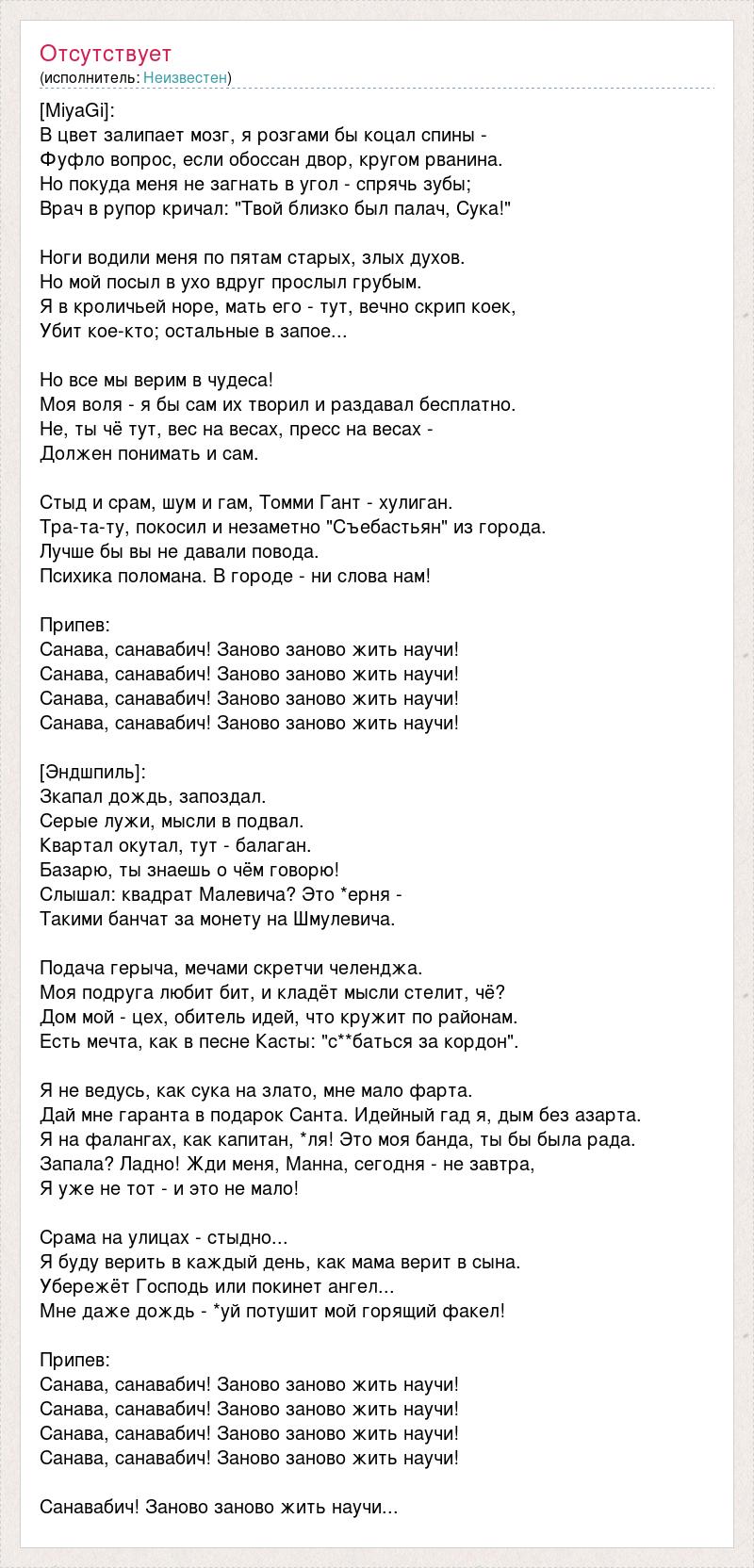 [MiyaGi]: В цвет залипает мозг, я розгами бы коцал спины - Фуфло вопрос, если обоссан двор, кругом рванина. Но покуда меня не загнать в угол - спрячь зубы; Врач в рупор кричал: "Твой близко был палач, Сука!" Ноги водили меня по пятам старых, злых духов. Но мой посыл в ухо вдруг прослыл грубым. Я в кроличьей норе, мать его - тут, вечно скрип коек, Убит кое-кто; остальные в запое... Но все мы верим в чудеса! Моя воля - я бы сам их творил и раздавал бесплатно. Не, ты чё тут, вес на весах, пресс на весах - Должен понимать и сам. Стыд и срам, шум и гам, Томми Гант - хулиган. Тра-та-ту, покосил и незаметно "Съебастьян" из города. Лучше бы вы не давали повода. Психика поломана. В городе - ни слова нам! Припев: Санава, санавабич! Заново заново жить научи! Санава, санавабич! Заново заново жить научи! Санава, санавабич! Заново заново жить научи! Санава, санавабич! Заново заново жить научи! [Эндшпиль]: Зкапал дождь, запоздал. Серые лужи, мысли в подвал. Квартал окутал, тут - балаган. Базарю, ты знаешь о чём говорю! Слышал: квадрат Малевича? Это *ерня - Такими банчат за монету на Шмулевича. Подача герыча, мечами скретчи челенджа. Моя подруга любит бит, и кладёт мысли стелит, чё? Дом мой - цех, обитель идей, что кружит по районам. Есть мечта, как в песне Касты: "с**баться за кордон". Я не ведусь, как сука на злато, мне мало фарта. Дай мне гаранта в подарок Санта. Идейный гад я, дым без азарта. Я на фалангах, как капитан, *ля! Это моя банда, ты бы была рада. Запала? Ладно! Жди меня, Манна, сегодня - не завтра, Я уже не тот - и это не мало! Срама на улицах - стыдно... Я буду верить в каждый день, как мама верит в сына. Убережёт Господь или покинет ангел... Мне даже дождь - *уй потушит мой горящий факел! Припев: Санава, санавабич! Заново заново жить научи! Санава, санавабич! Заново заново жить научи! Санава, санавабич! Заново заново жить научи! Санава, санавабич! Заново заново жить научи! Санавабич! Заново заново жить научи...